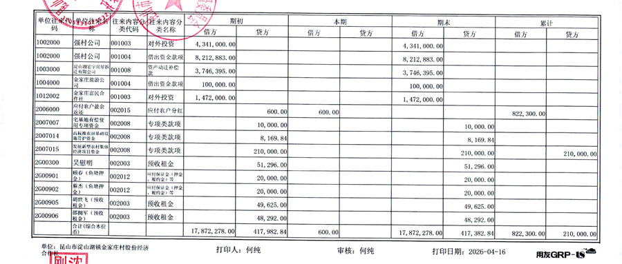 2026年3月金家庄村股份经济合作社财务公开