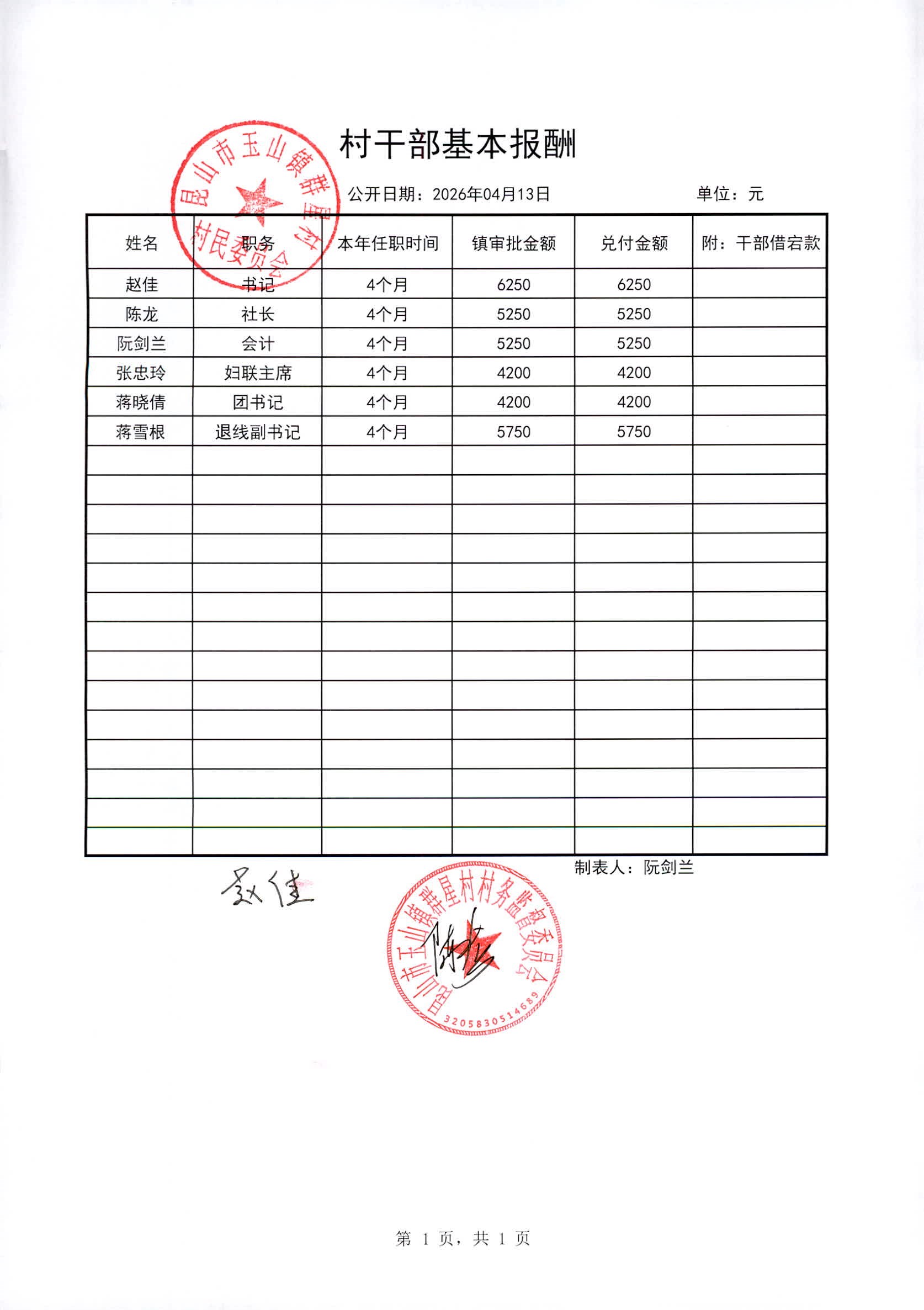 昆山高新区群星村2026年04月份公开村干部基本报酬信息