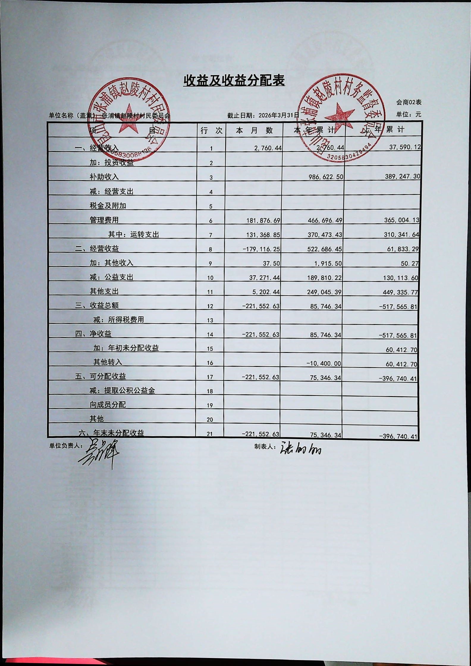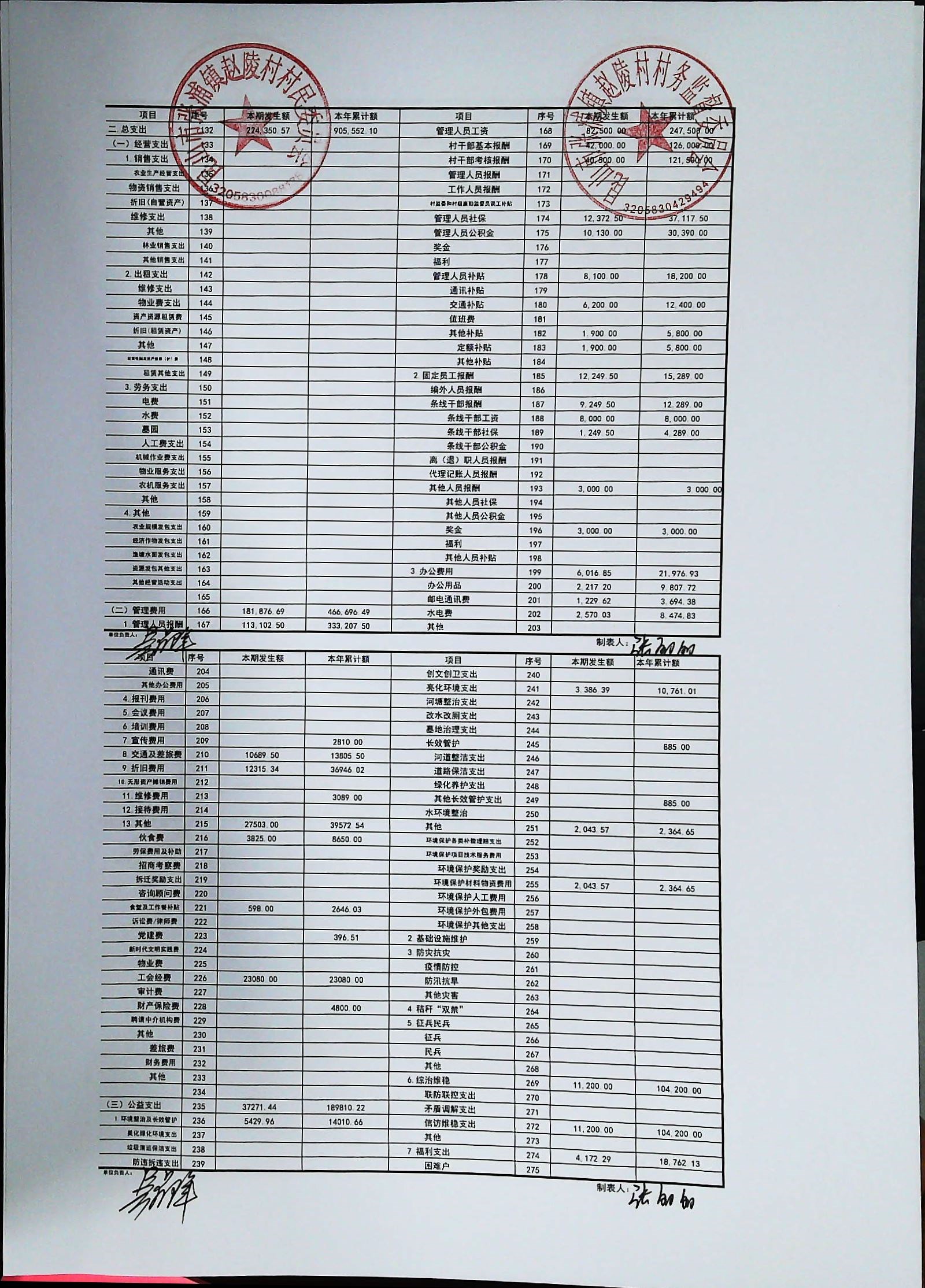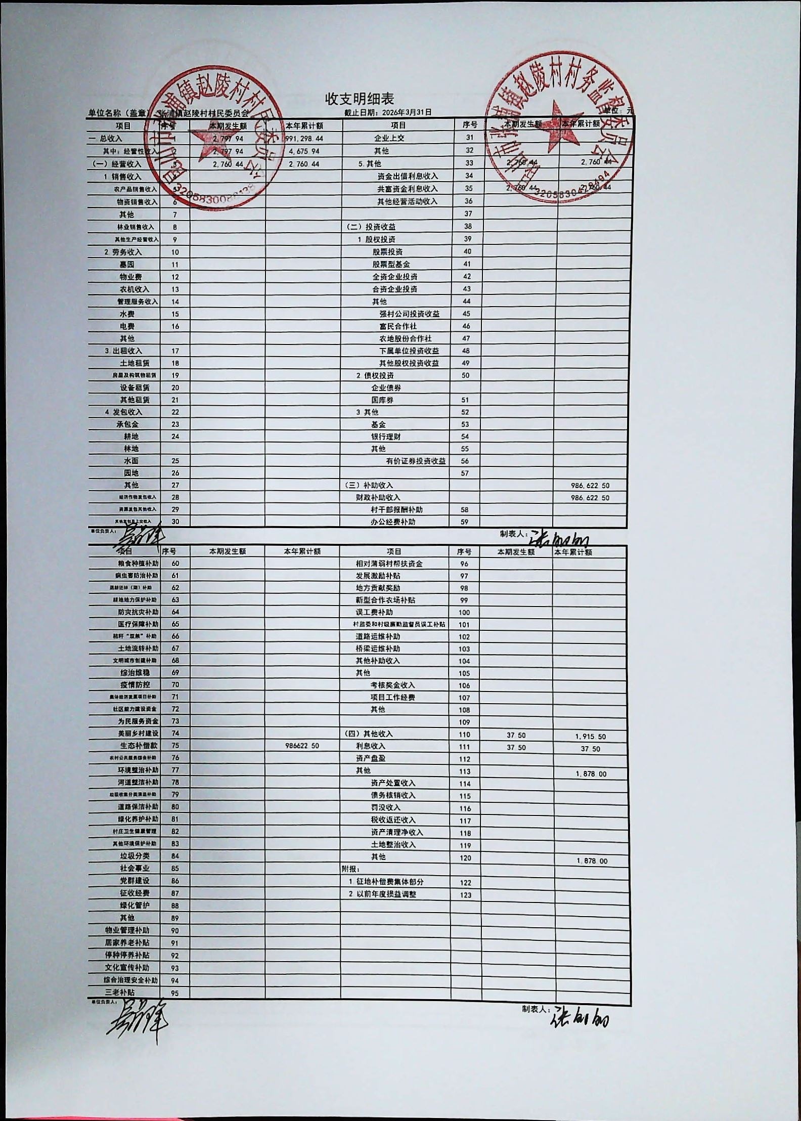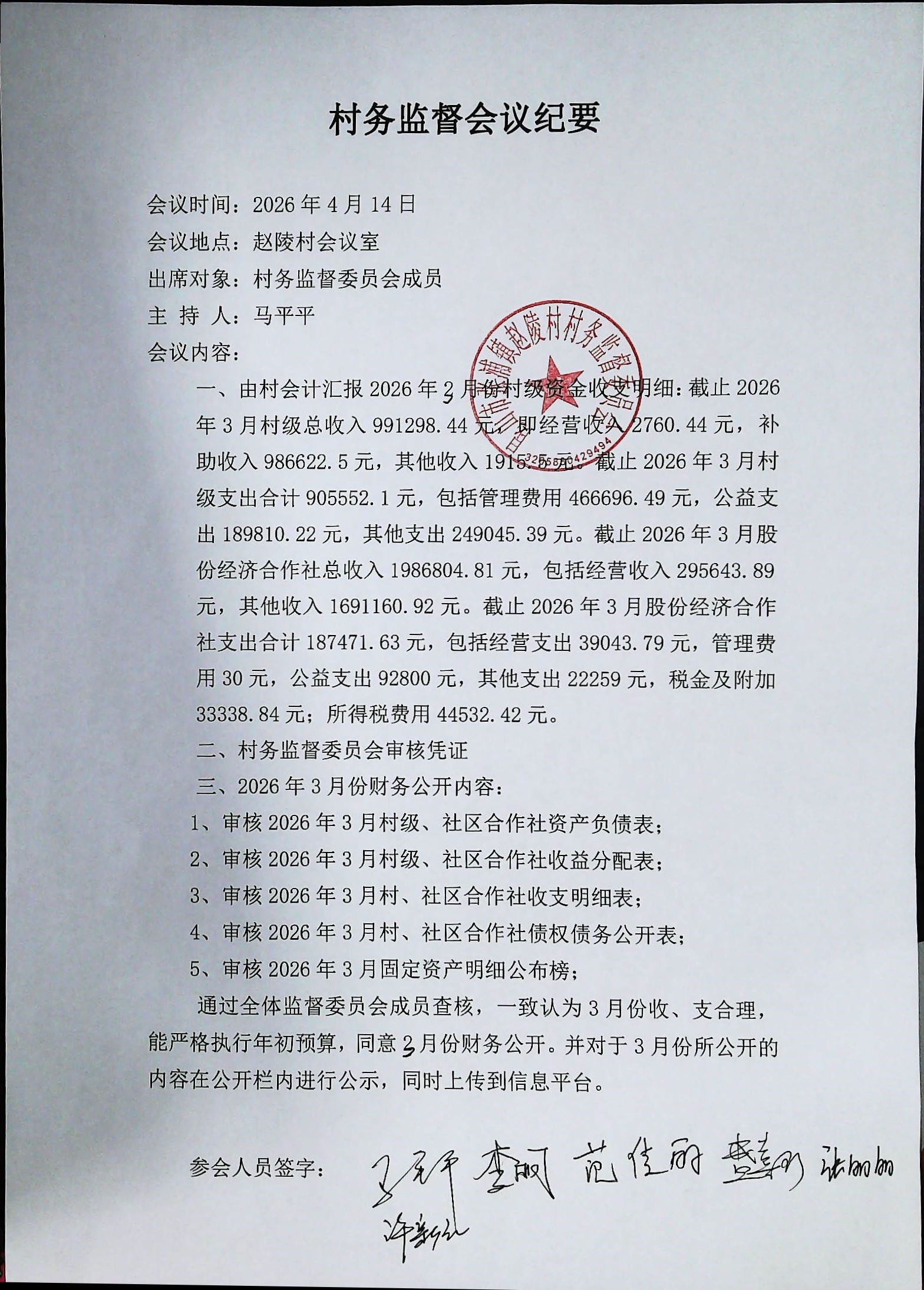 赵陵村2026年度3月份财务公开