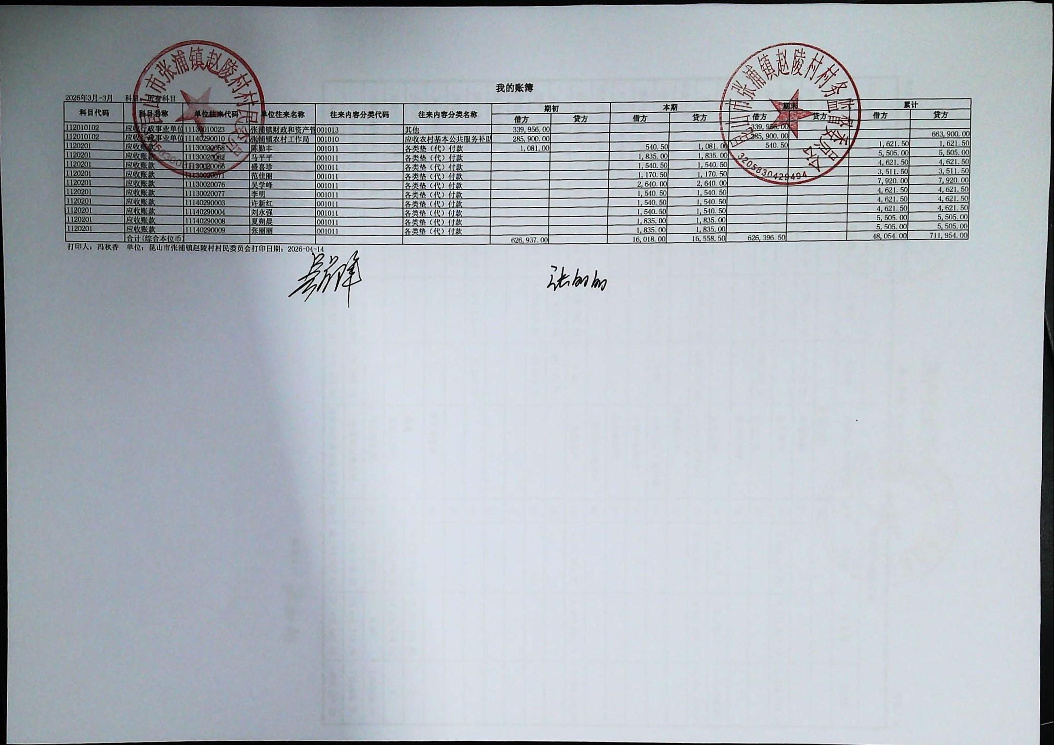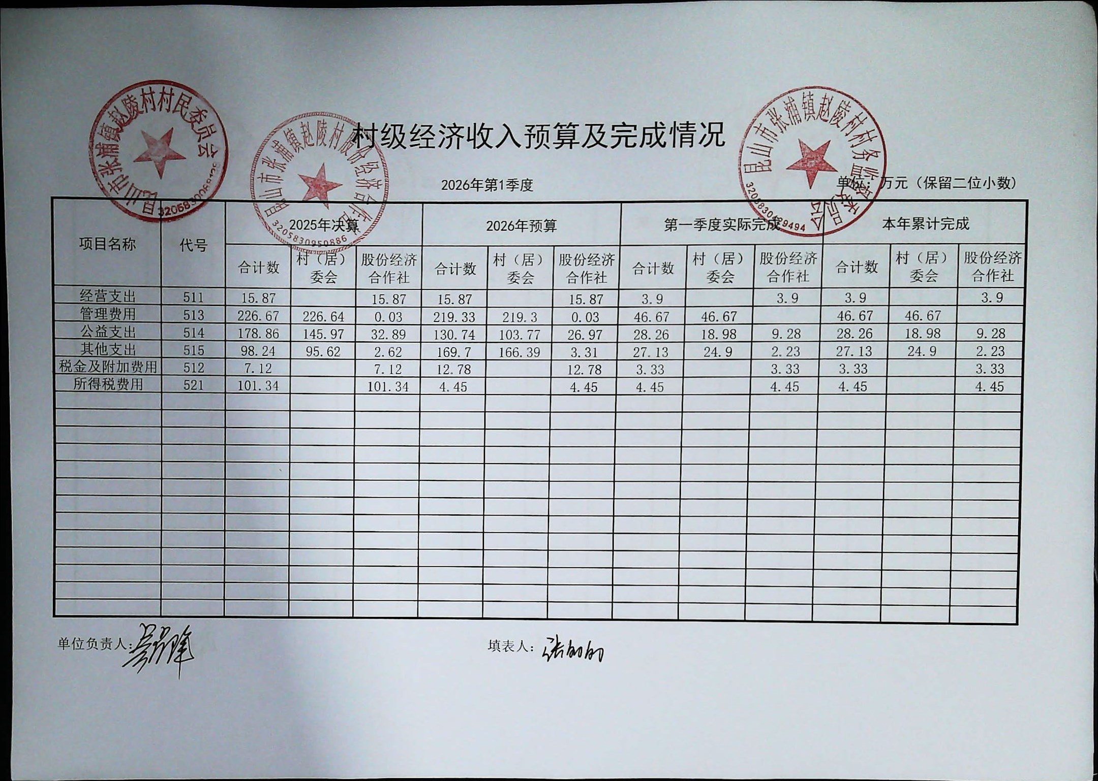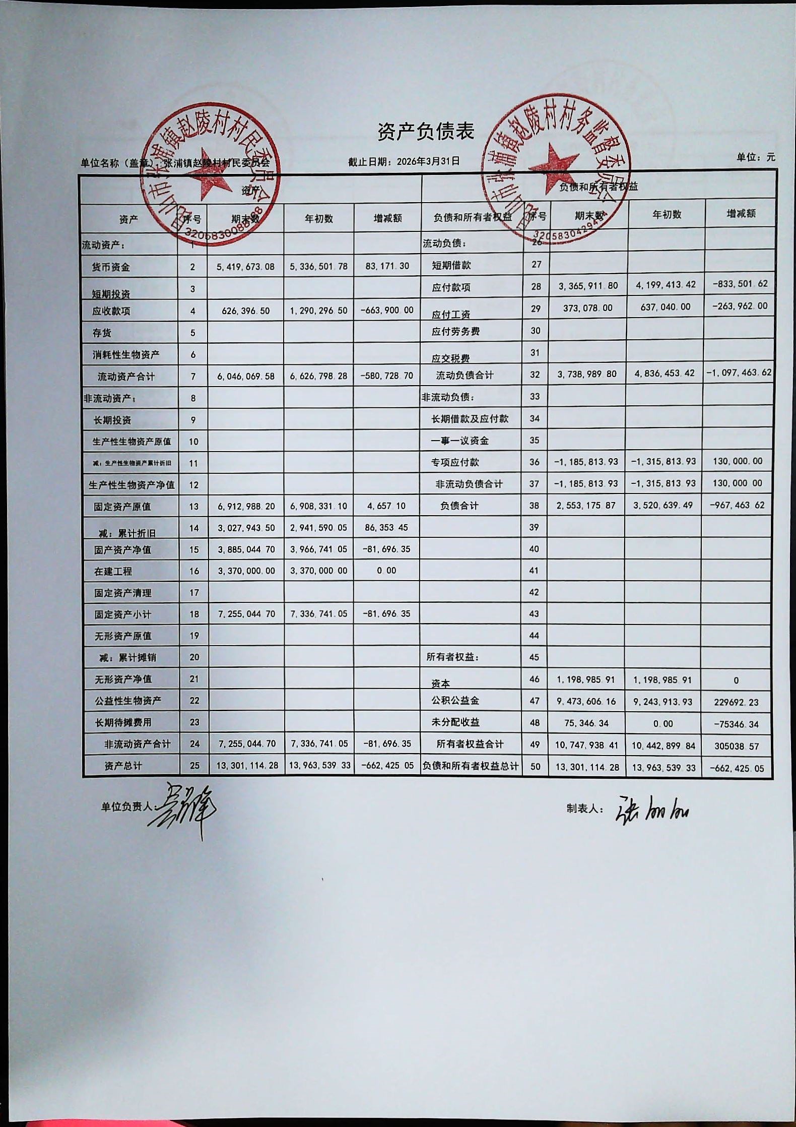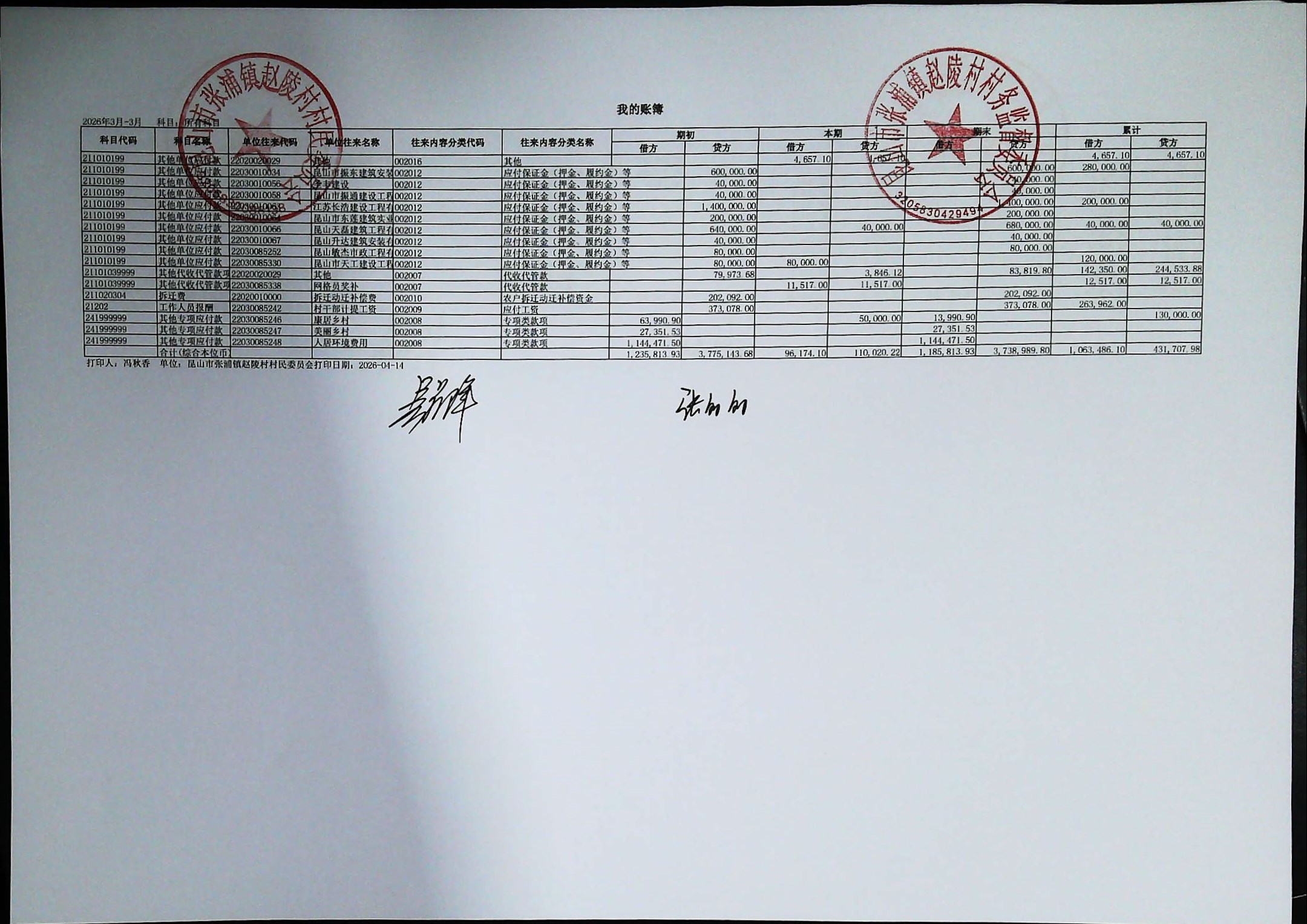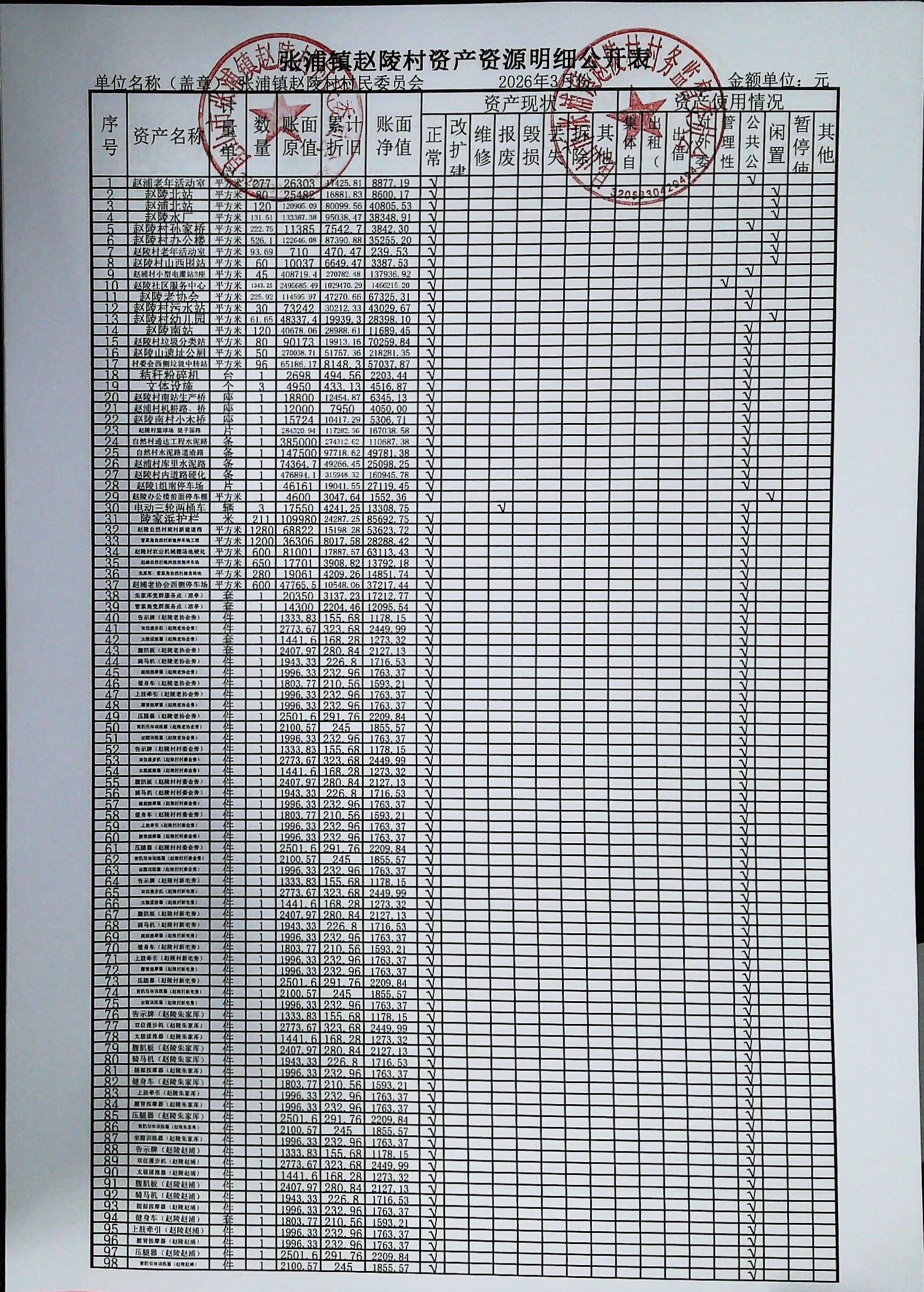 赵陵村2026年度3月份财务公开