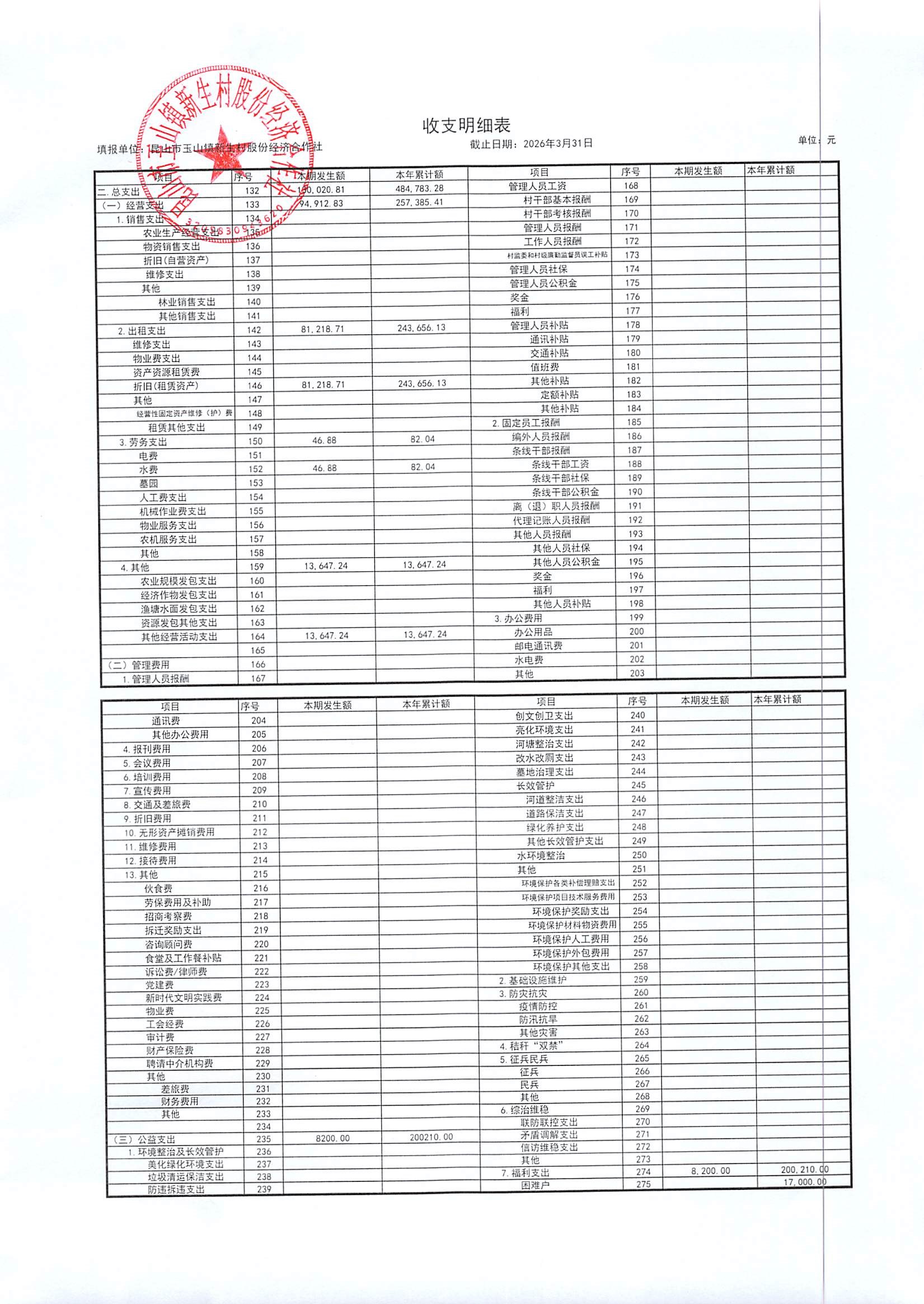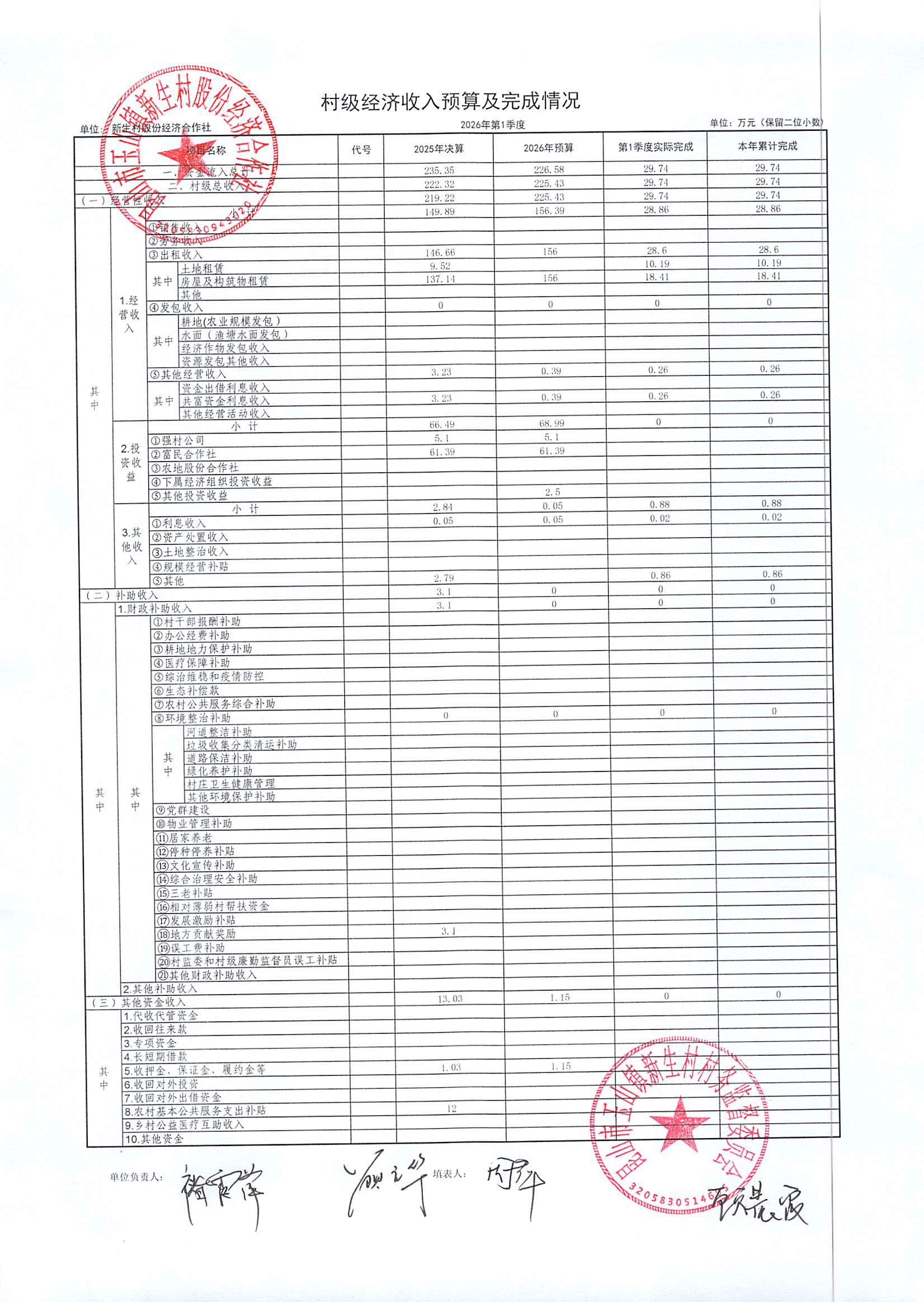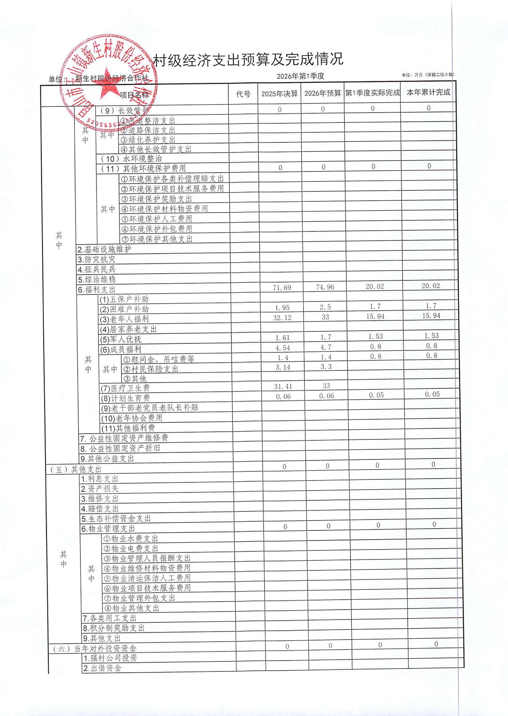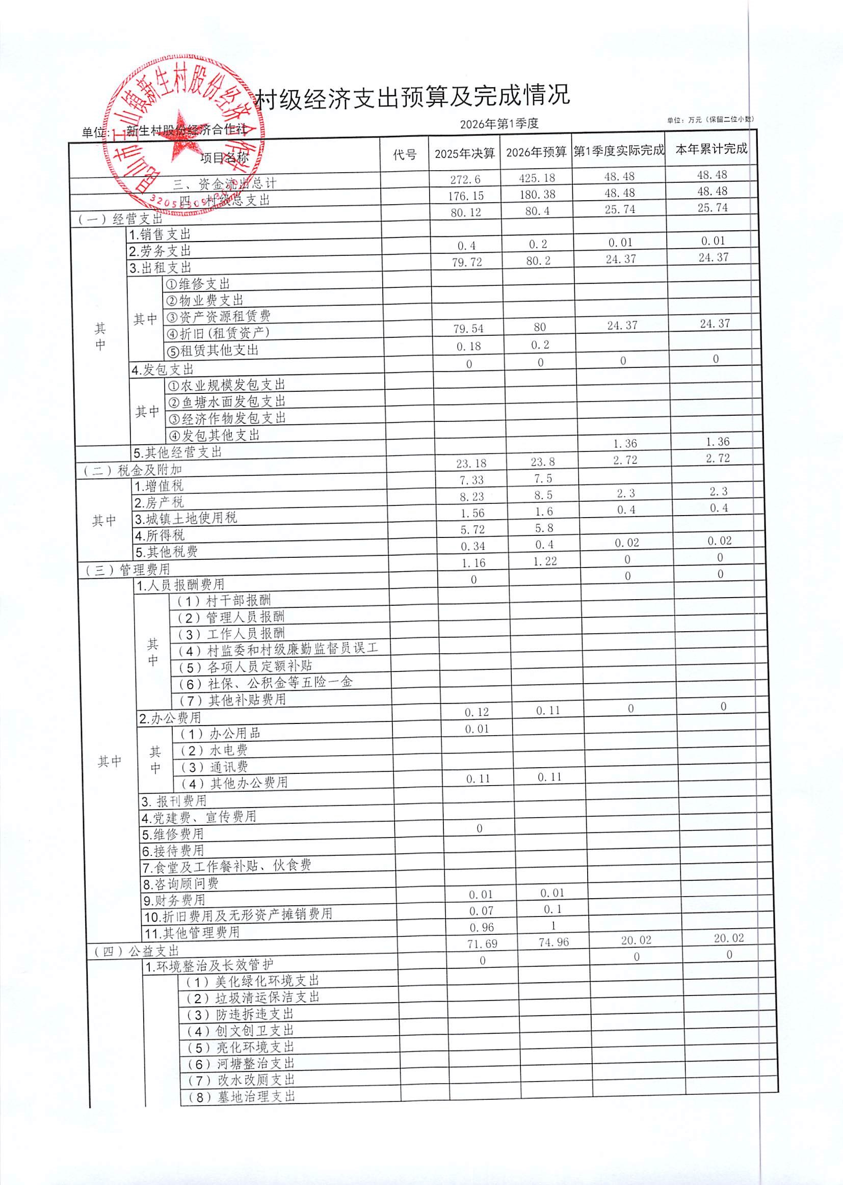 2026年4月新生村股份经济合作社财务公开