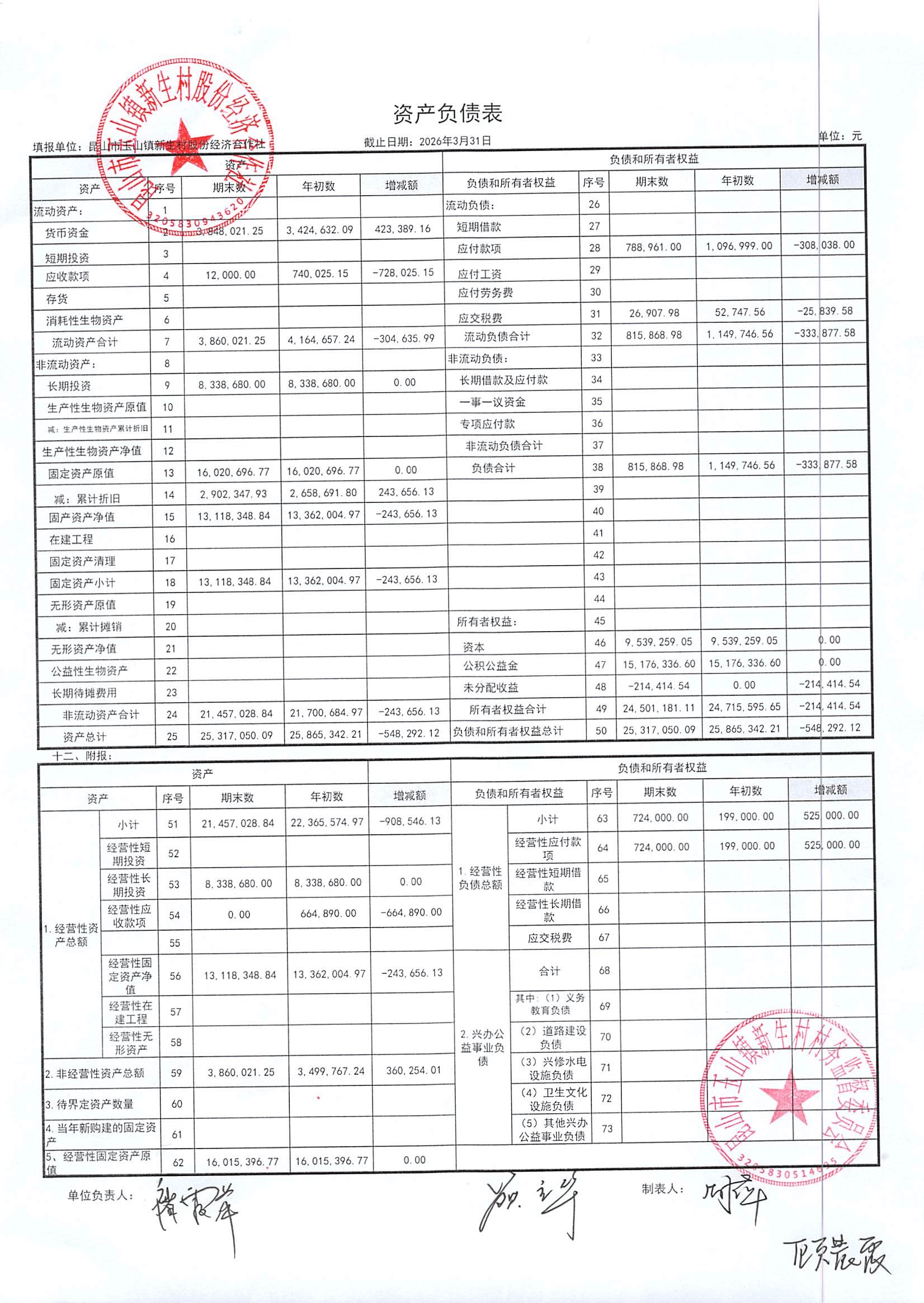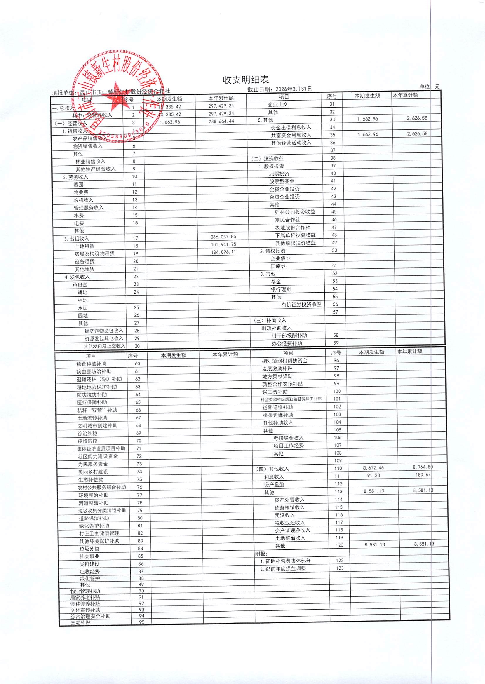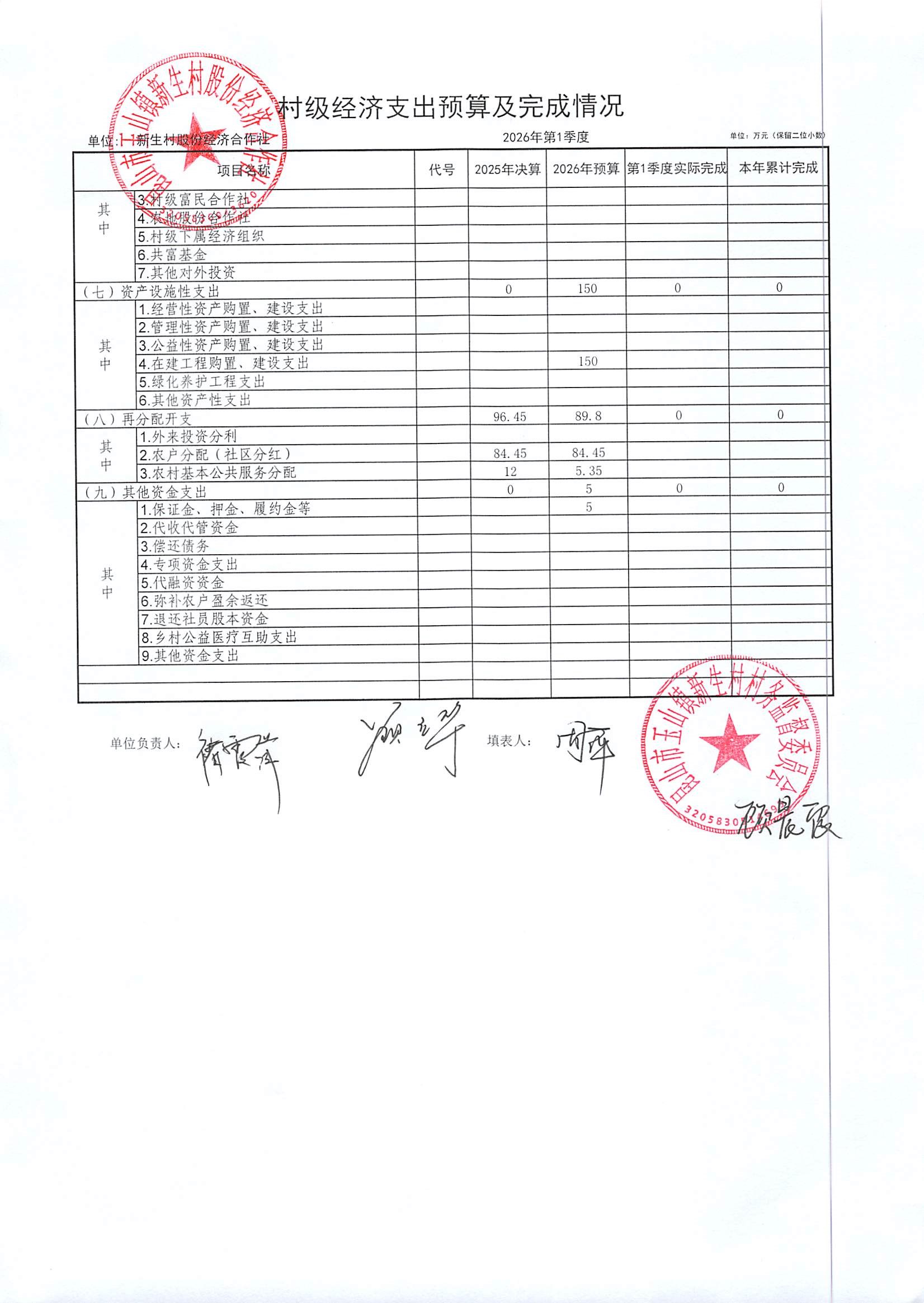 2026年4月新生村股份经济合作社财务公开