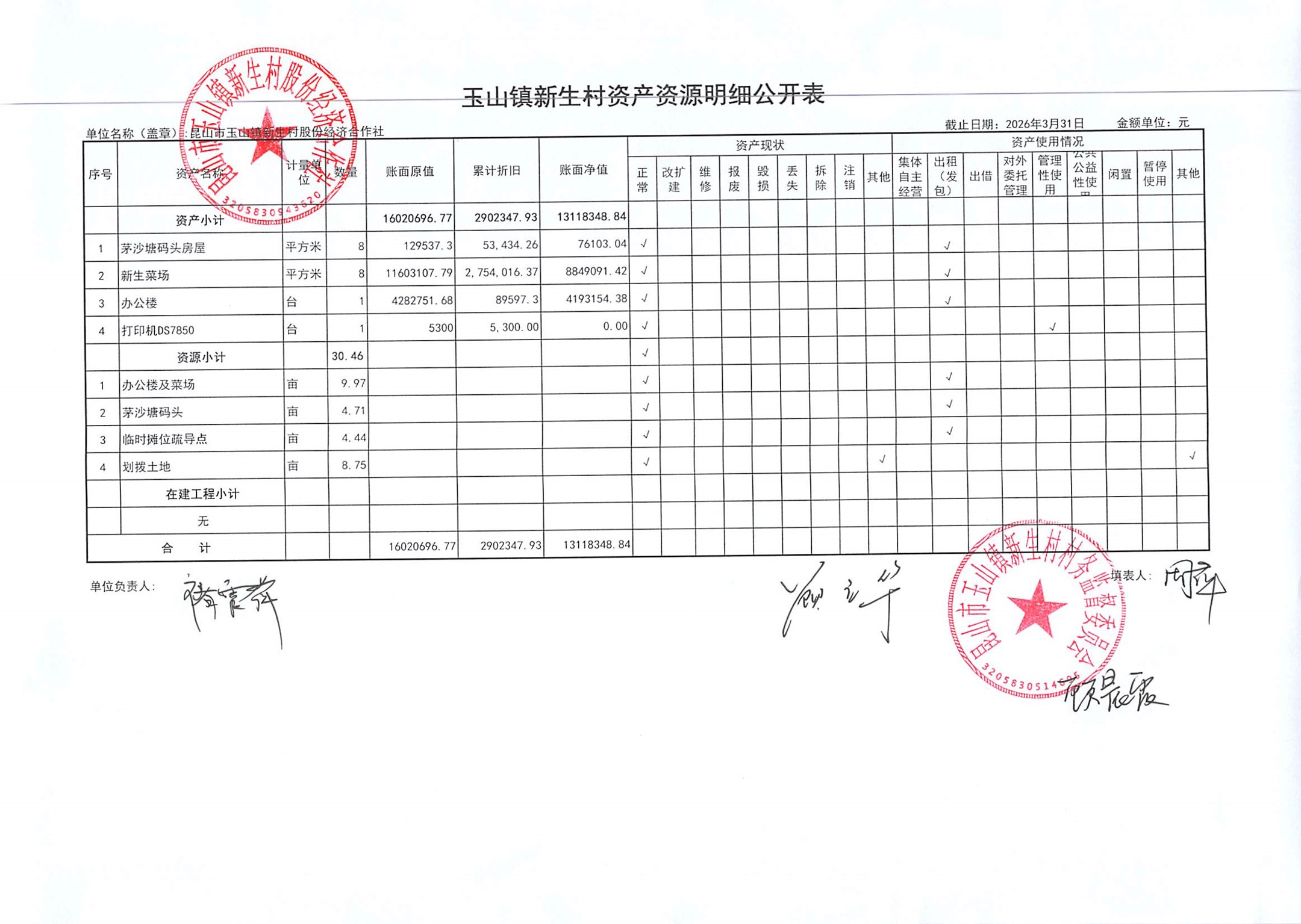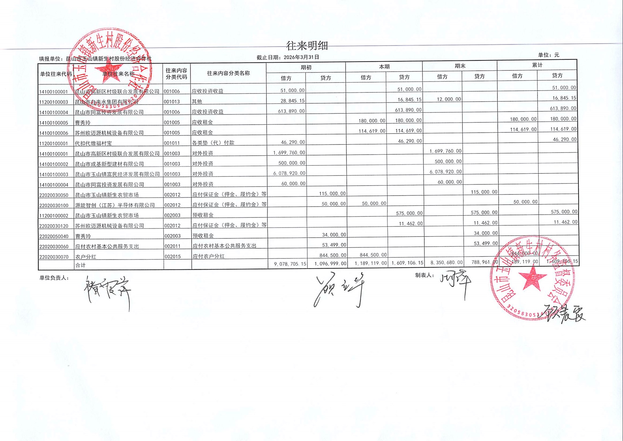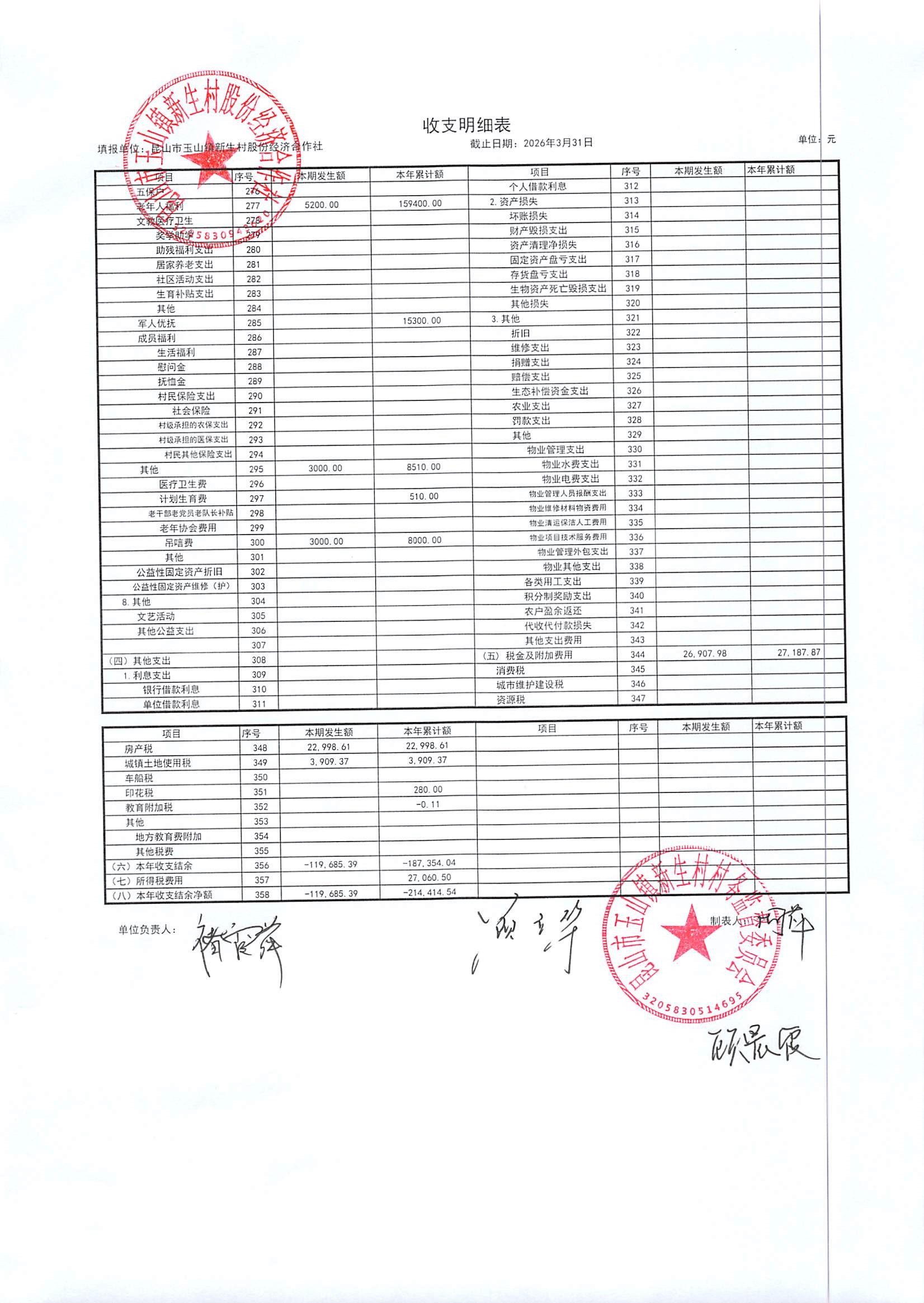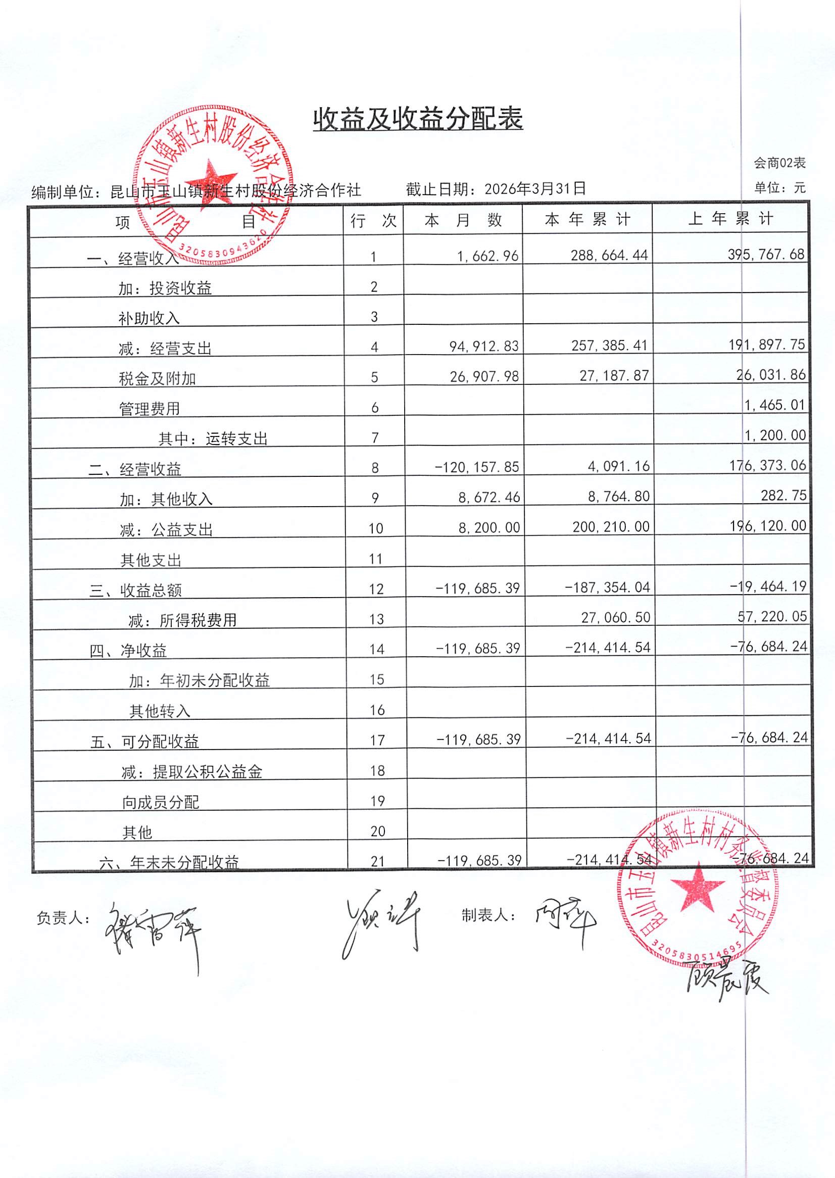 2026年4月新生村股份经济合作社财务公开