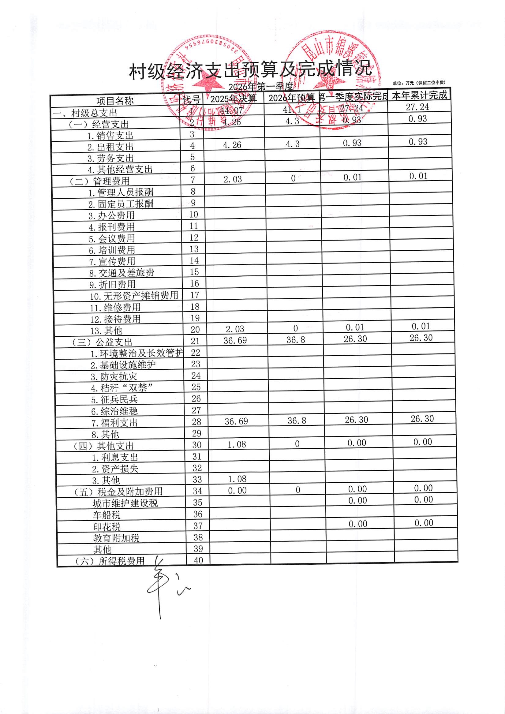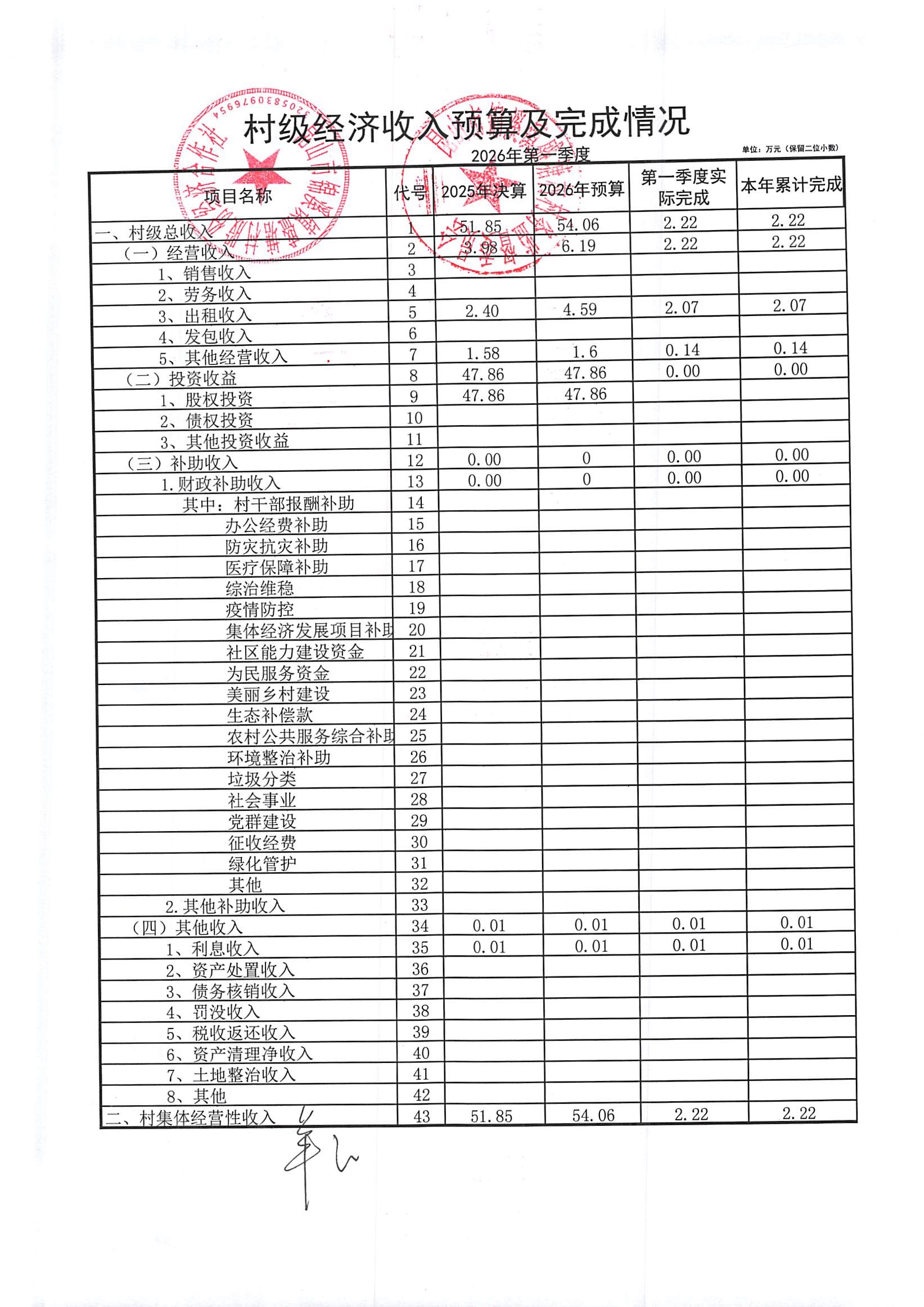 2026年第一季度村级社区经济收入、支出预算及完成情况