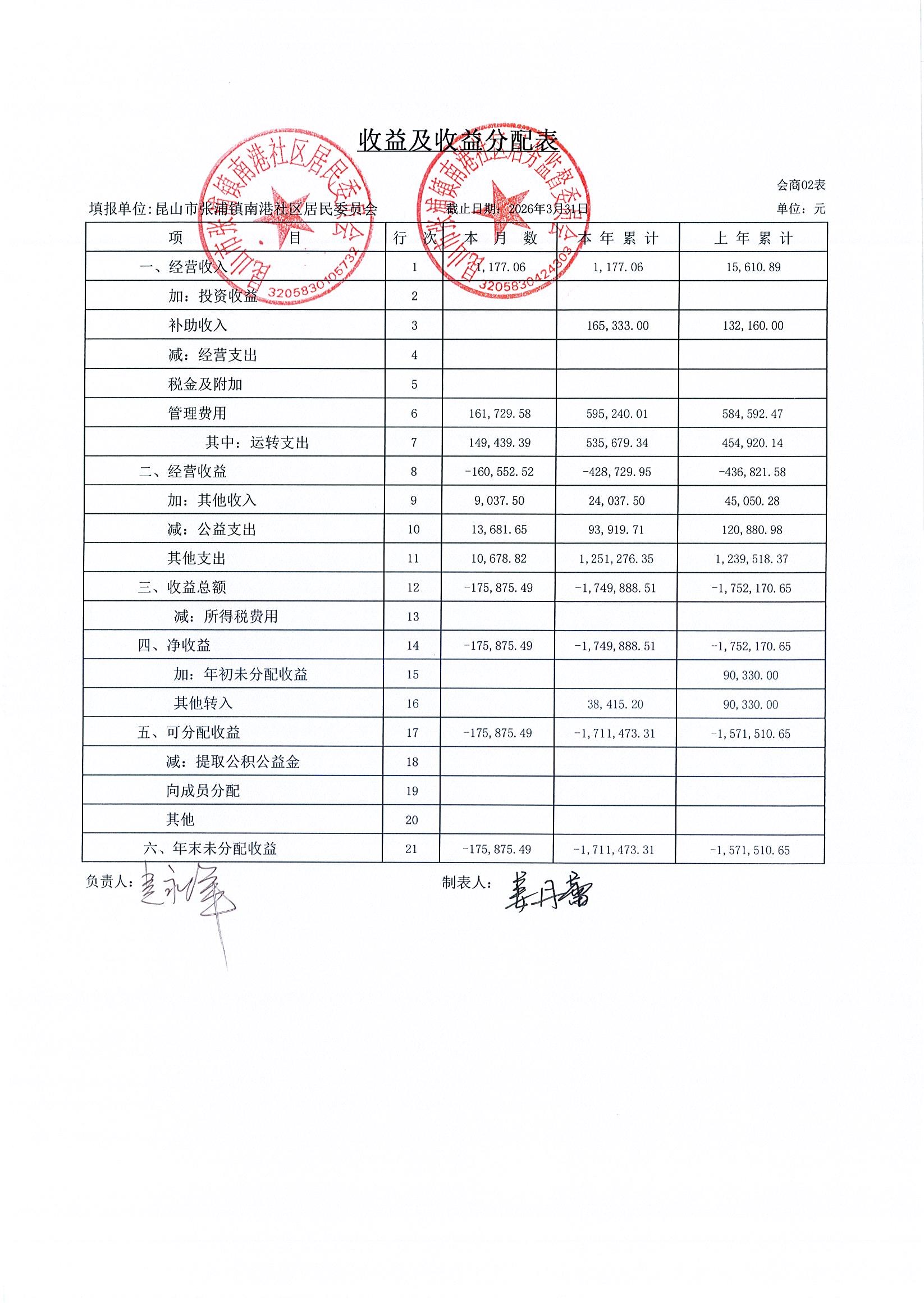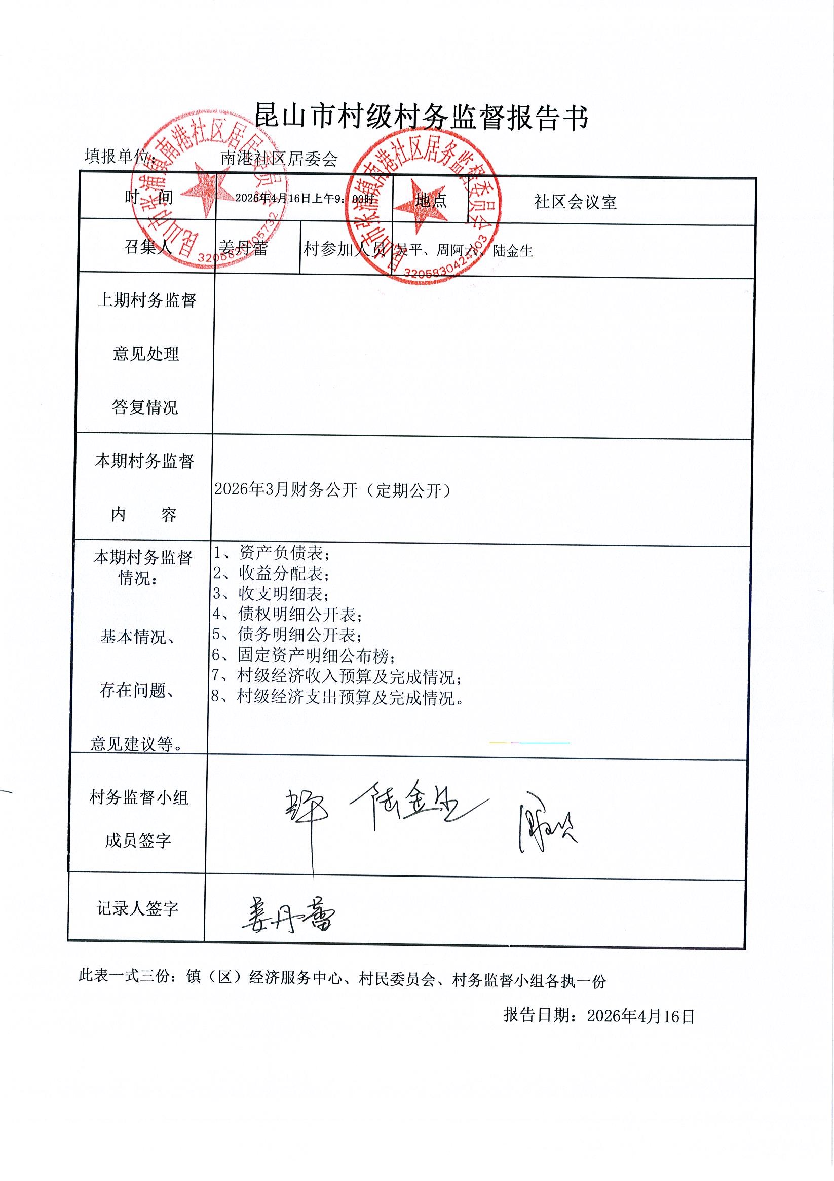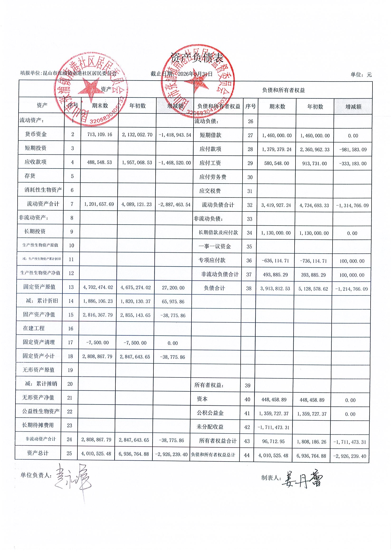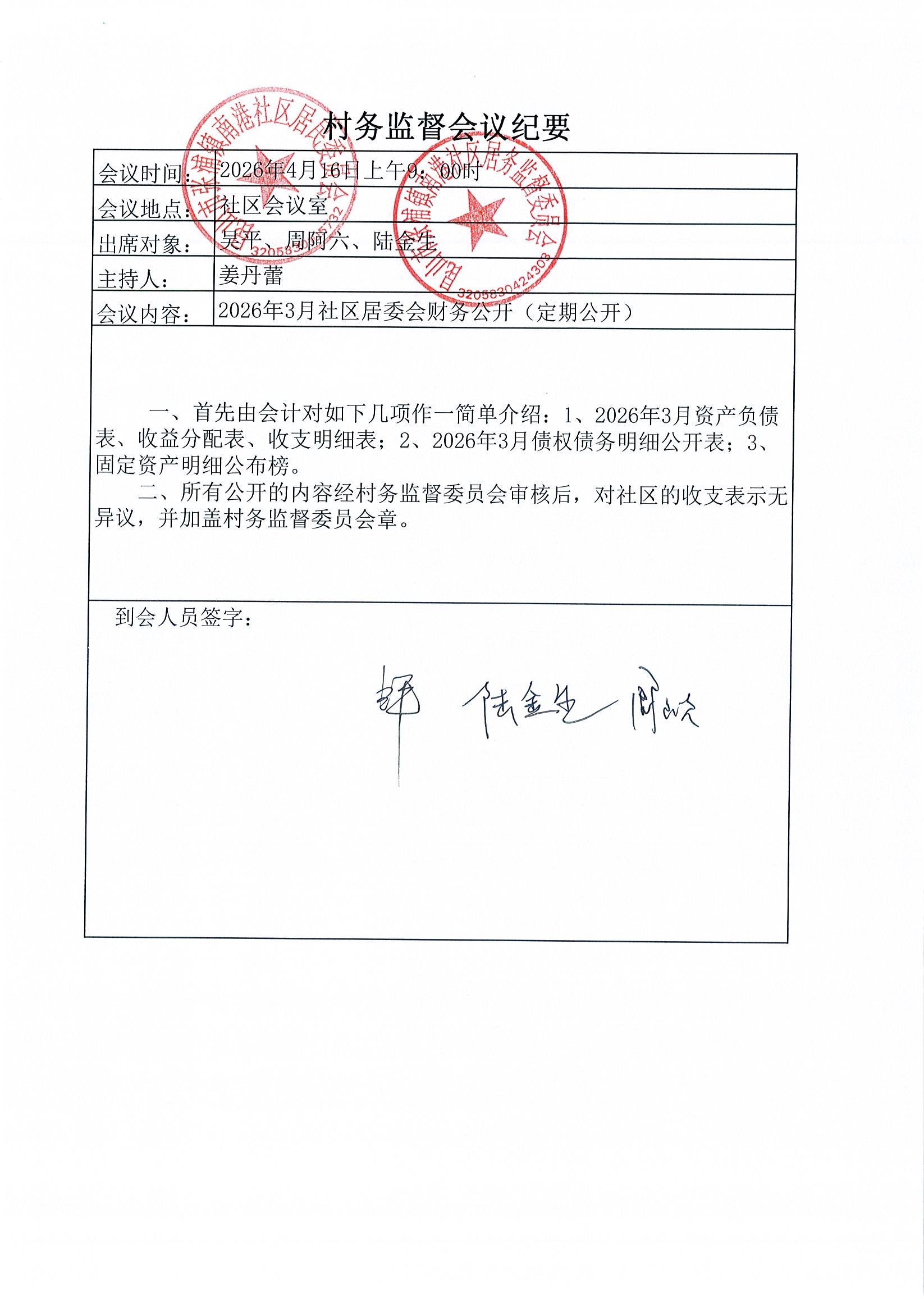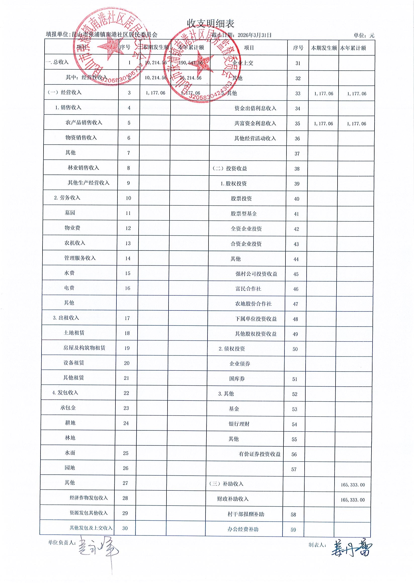 南港社区居委会2026年3月财务公开(定期公开)