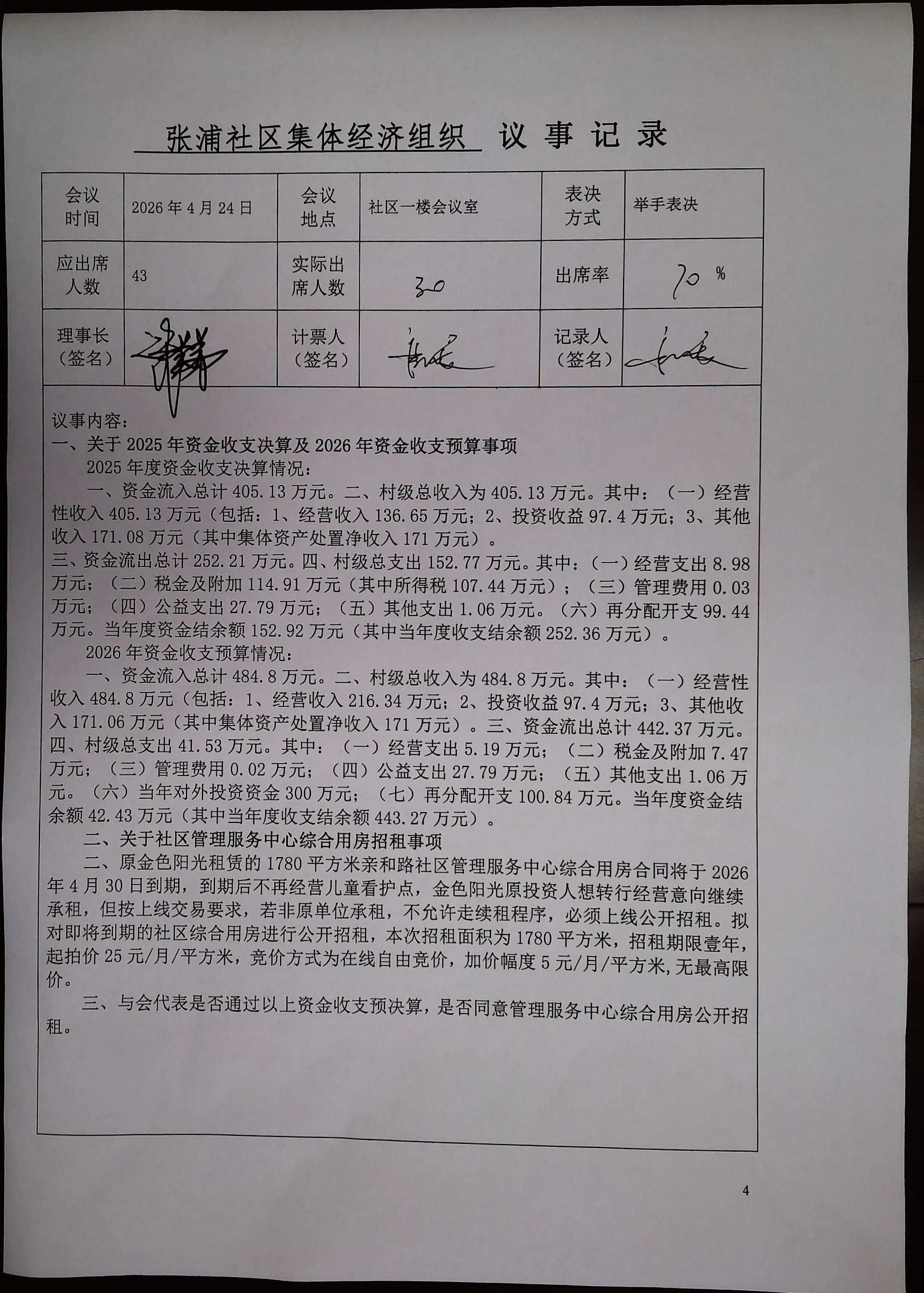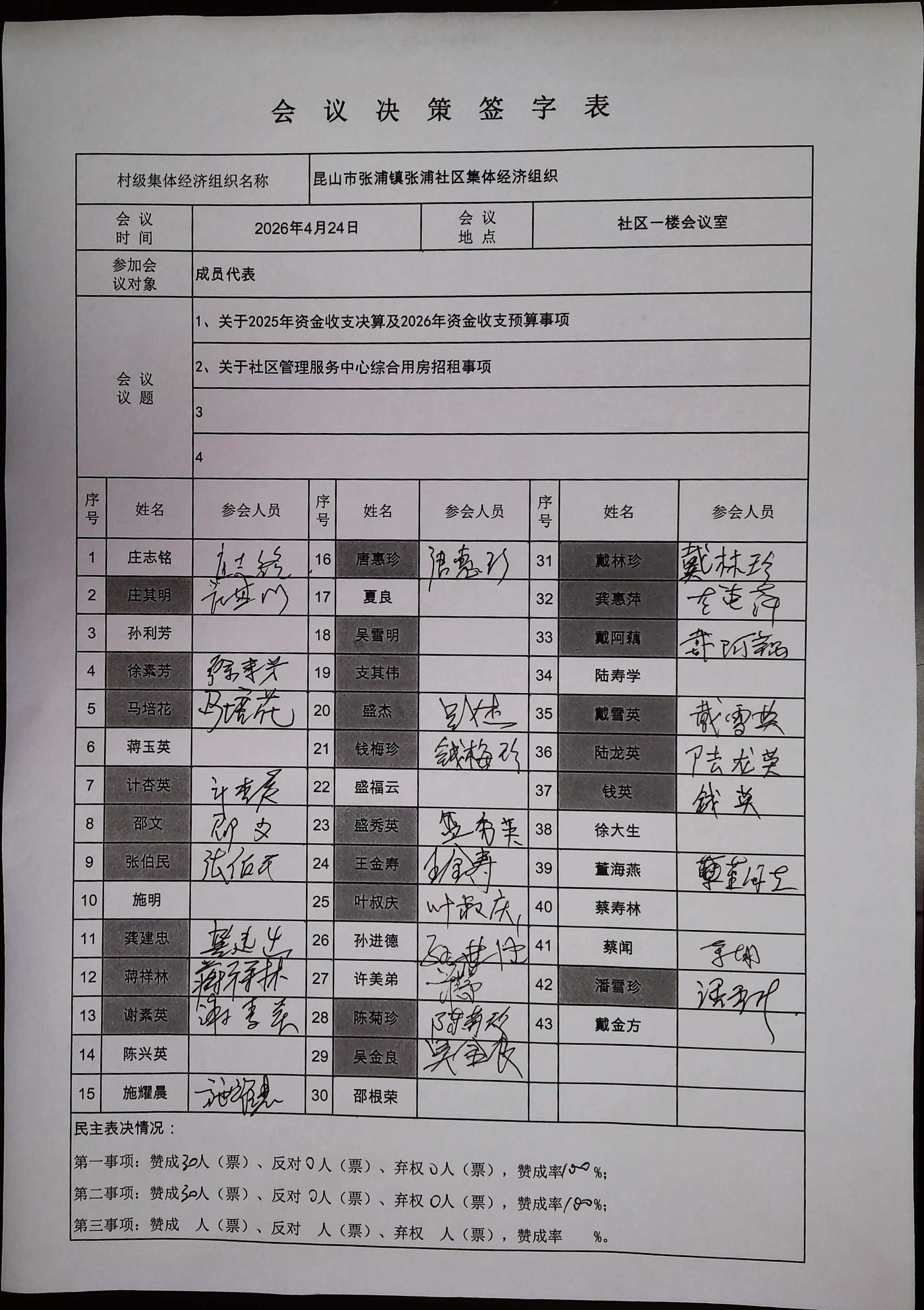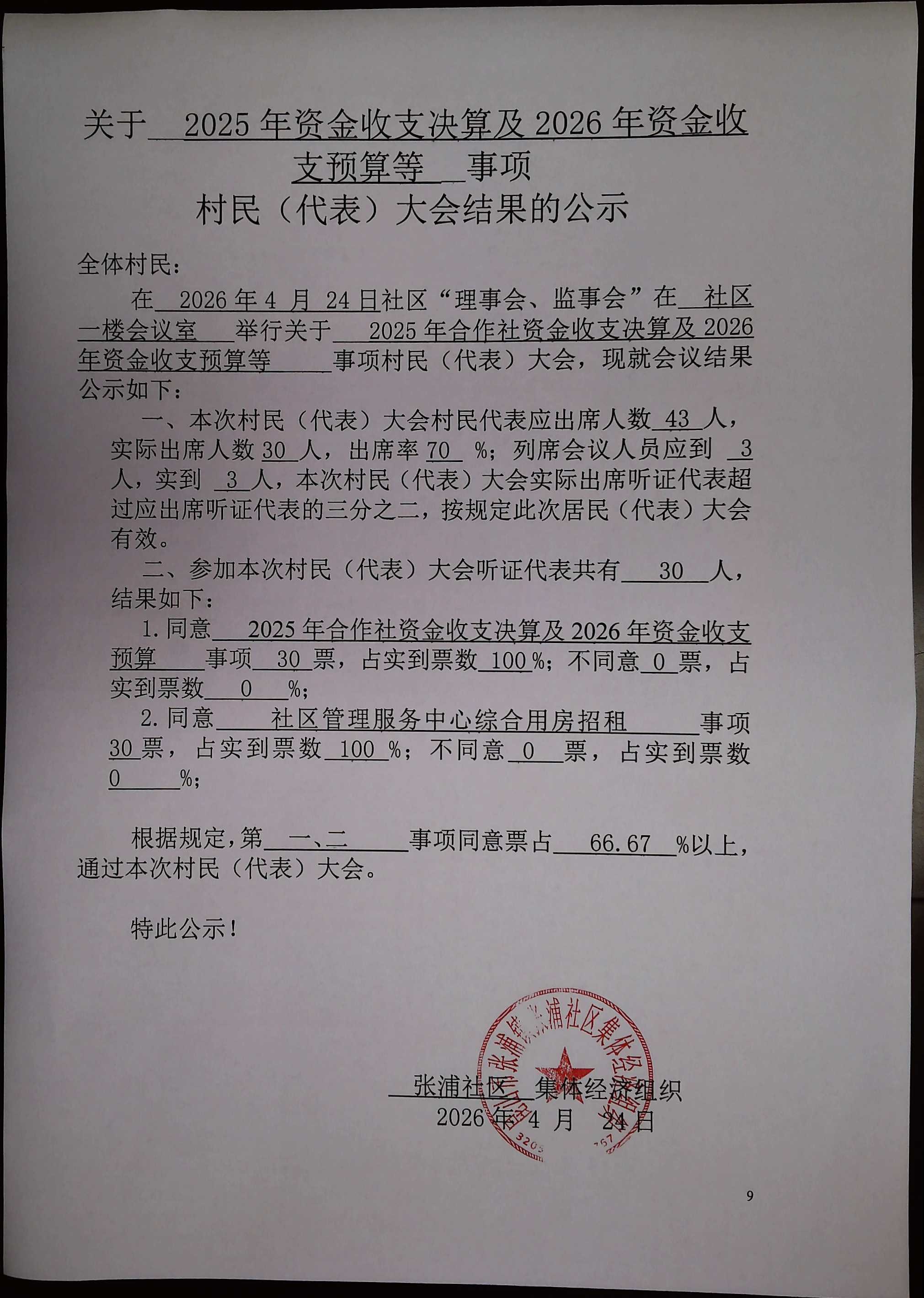 关于张浦社区合作社2025年资金收支决算及2026年资金收支预算等事项决策听证