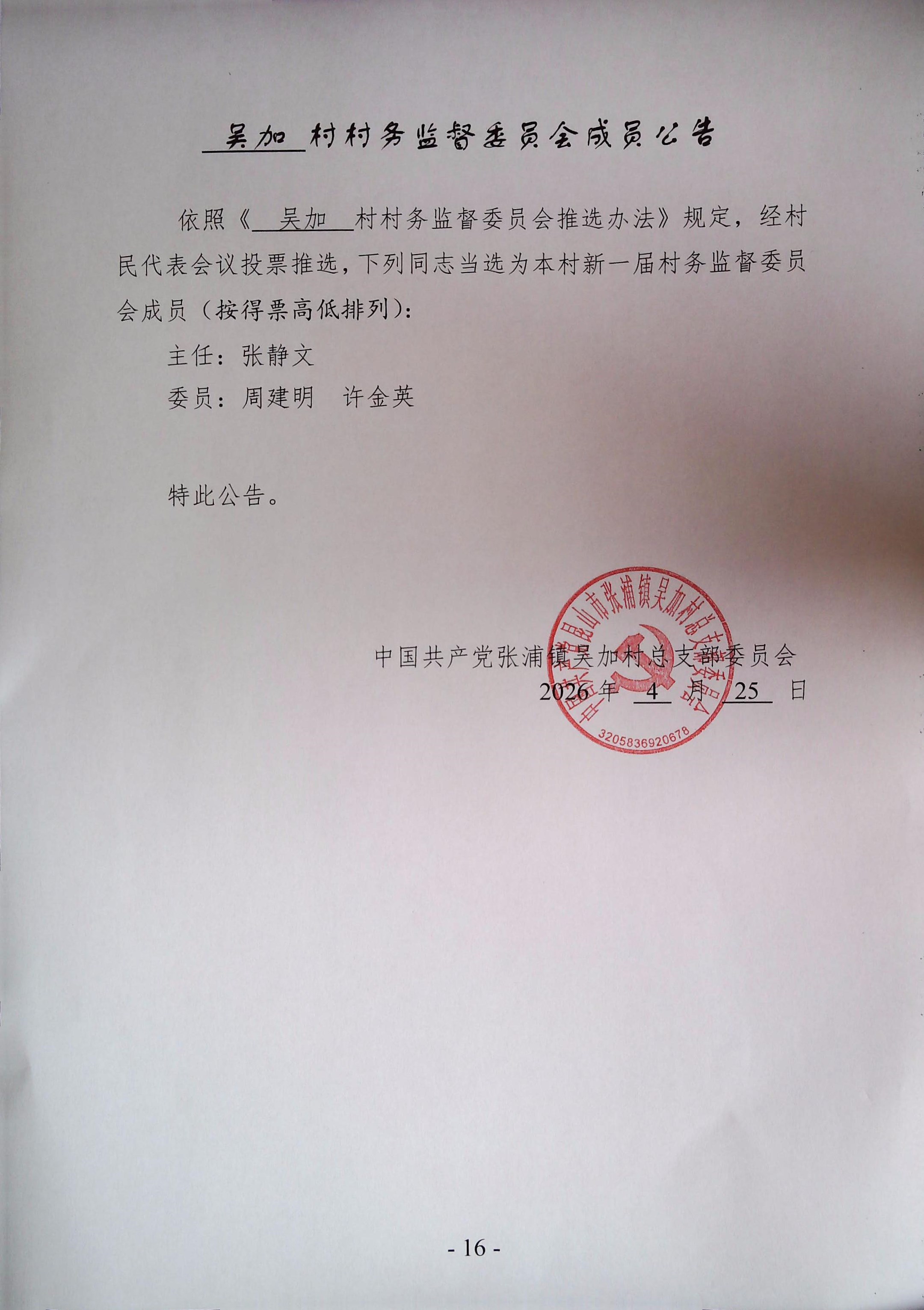 吴加村村务监督委员会成员公告