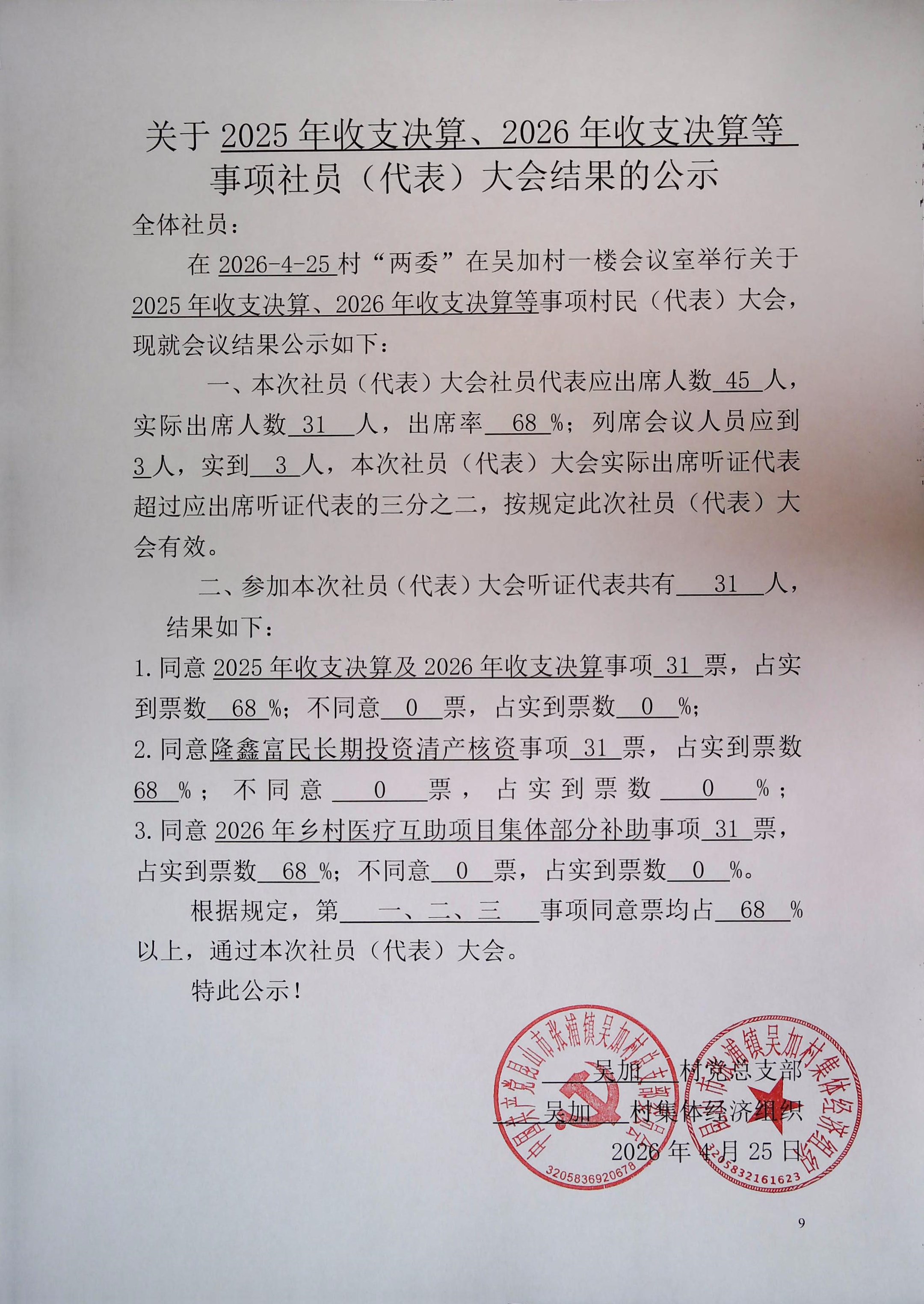 吴加村集体经济组织关于收支预决算、清产核资、乡村医疗互助事项社员(代表)大会结果的公示