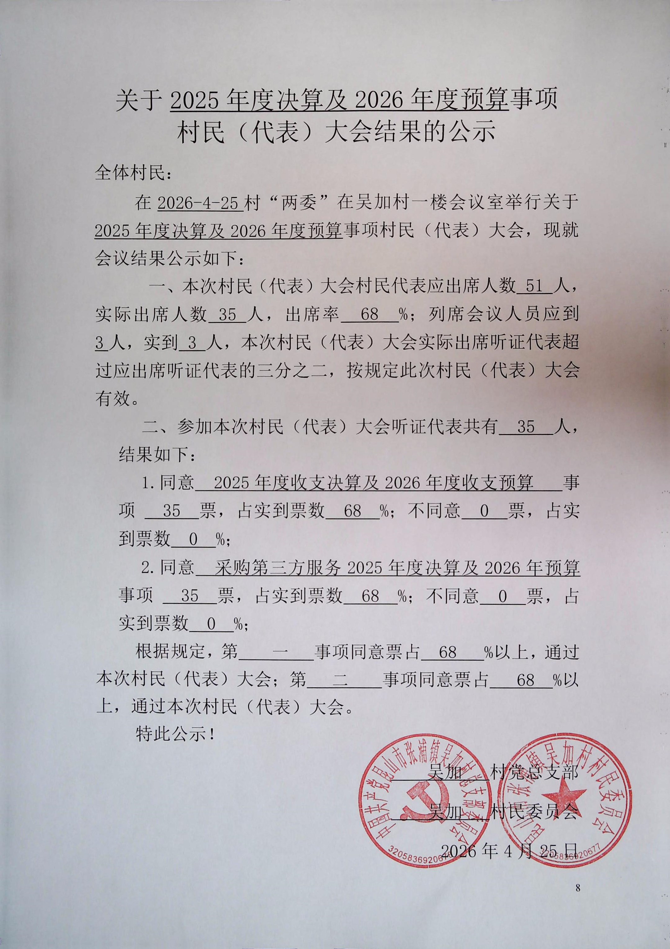 吴加村委会关于收支预决算及采购第三方服务预决算事项村民(代表)大会结果的公示