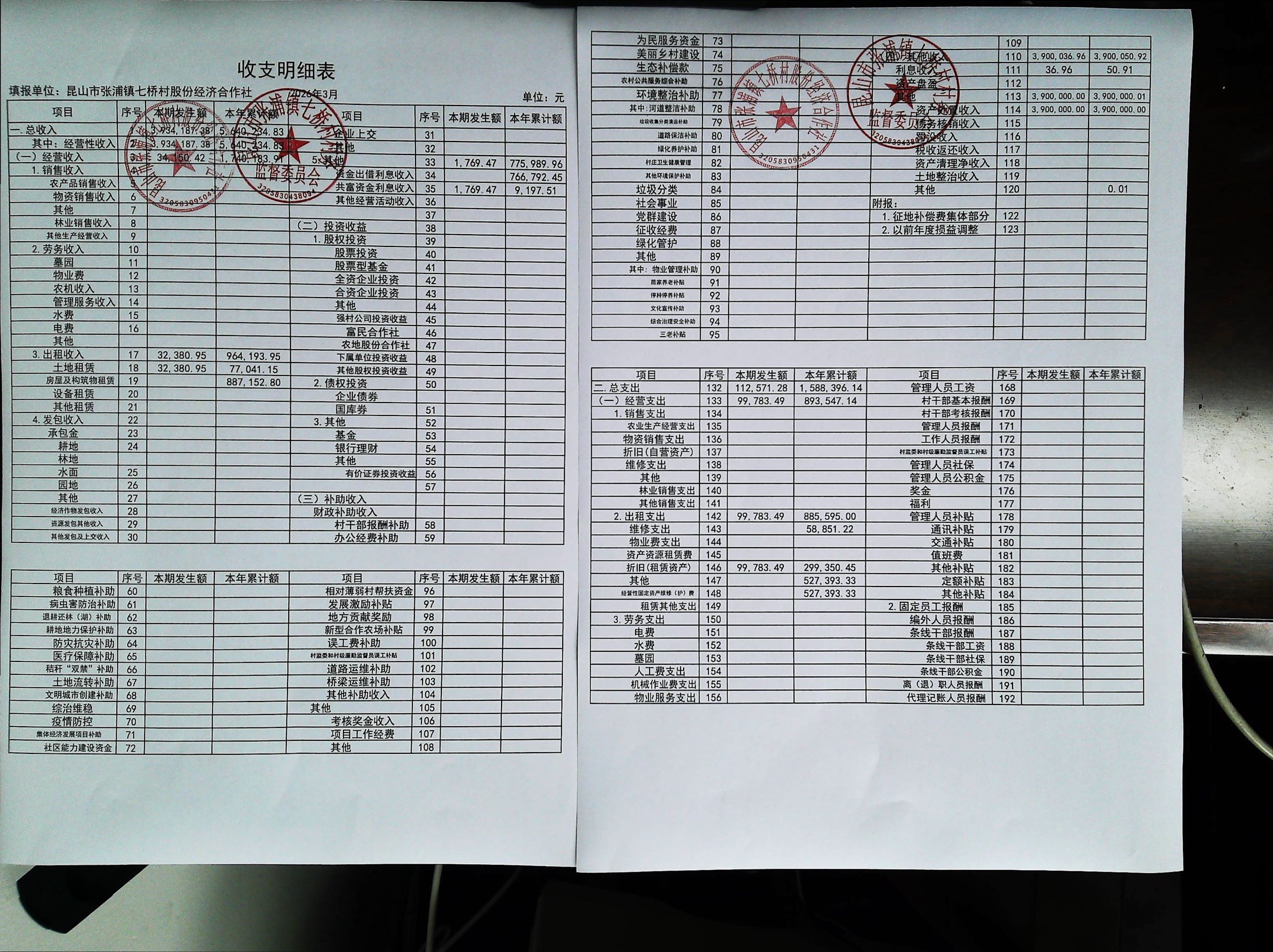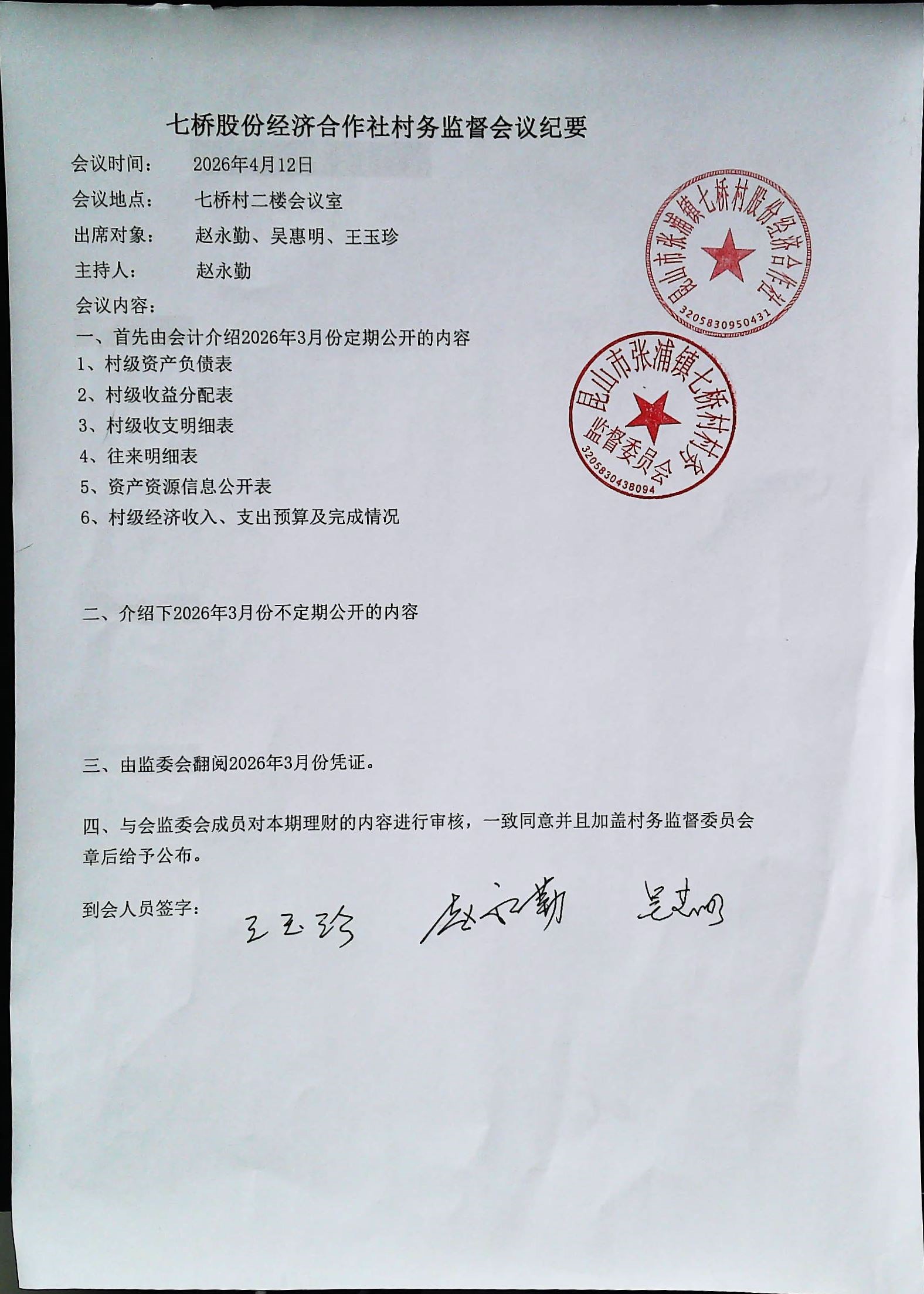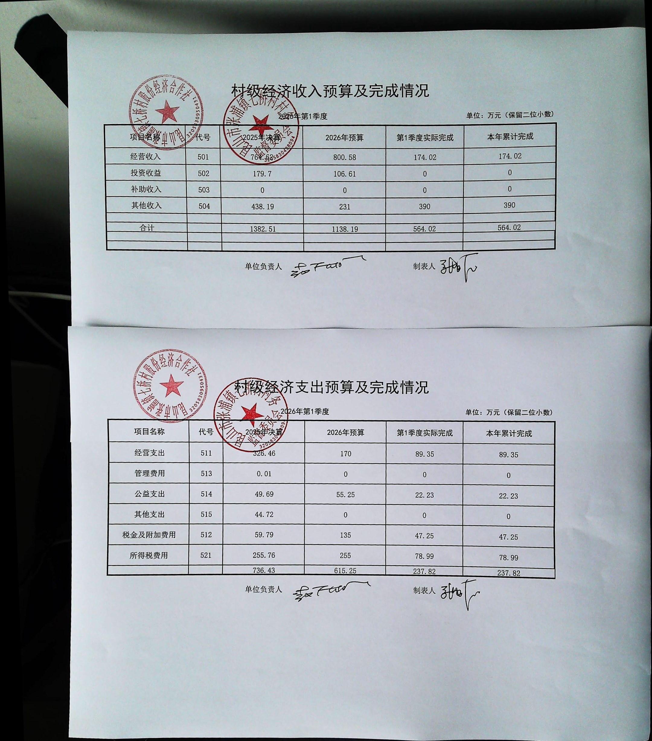 七桥村股份经济合作社2026年4月份财务公开