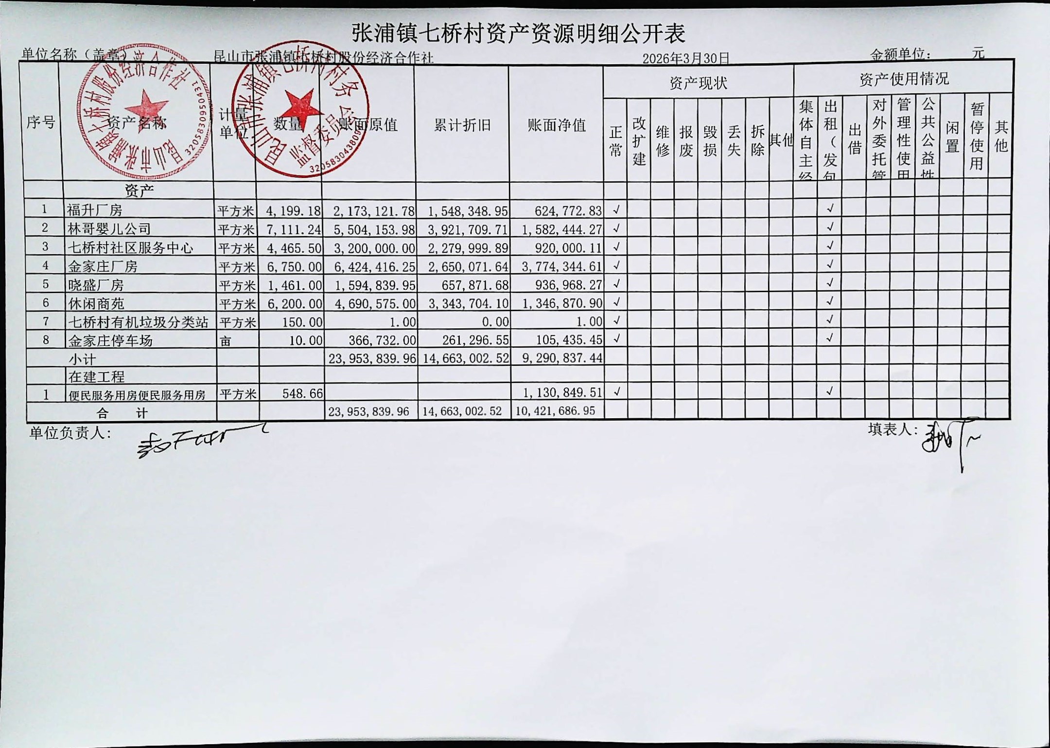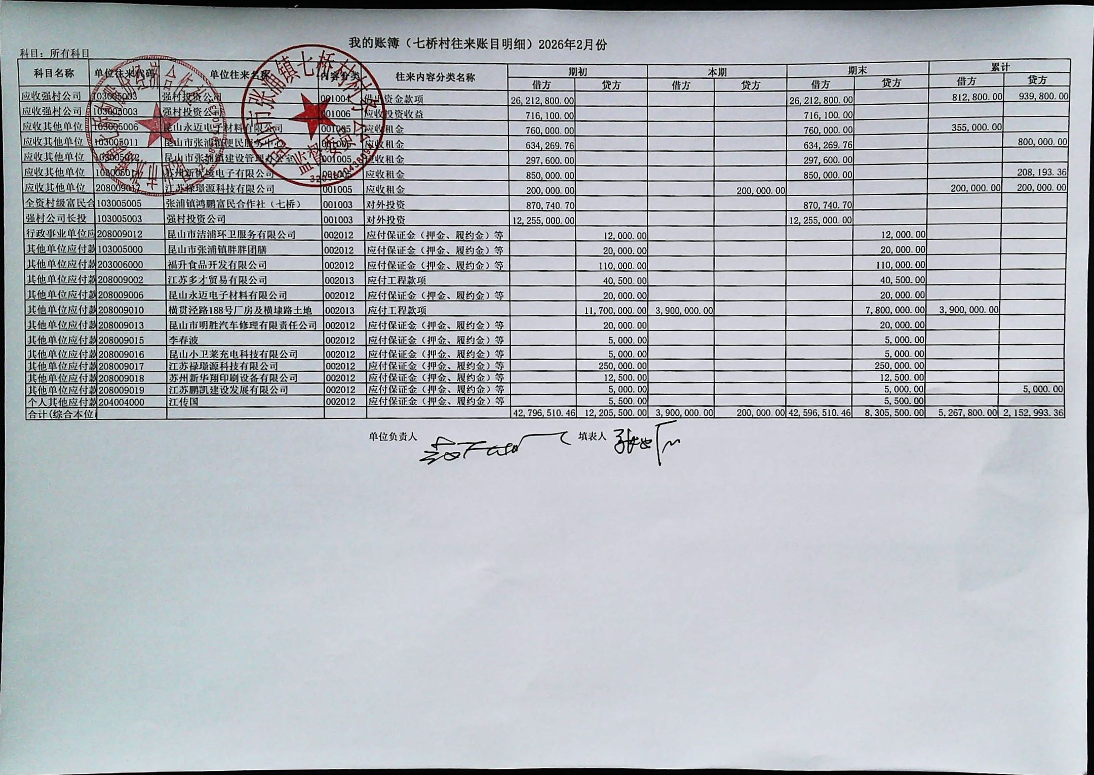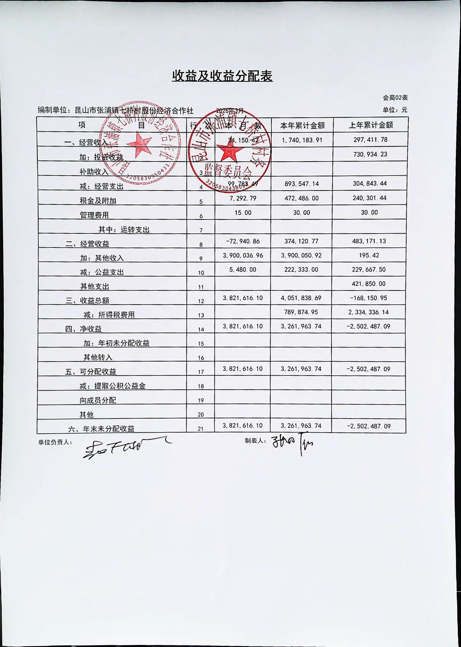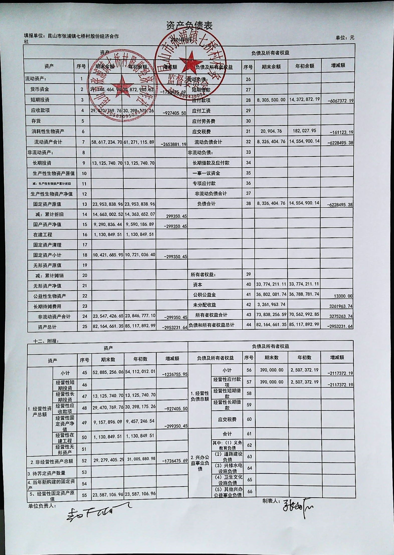 七桥村股份经济合作社2026年4月份财务公开