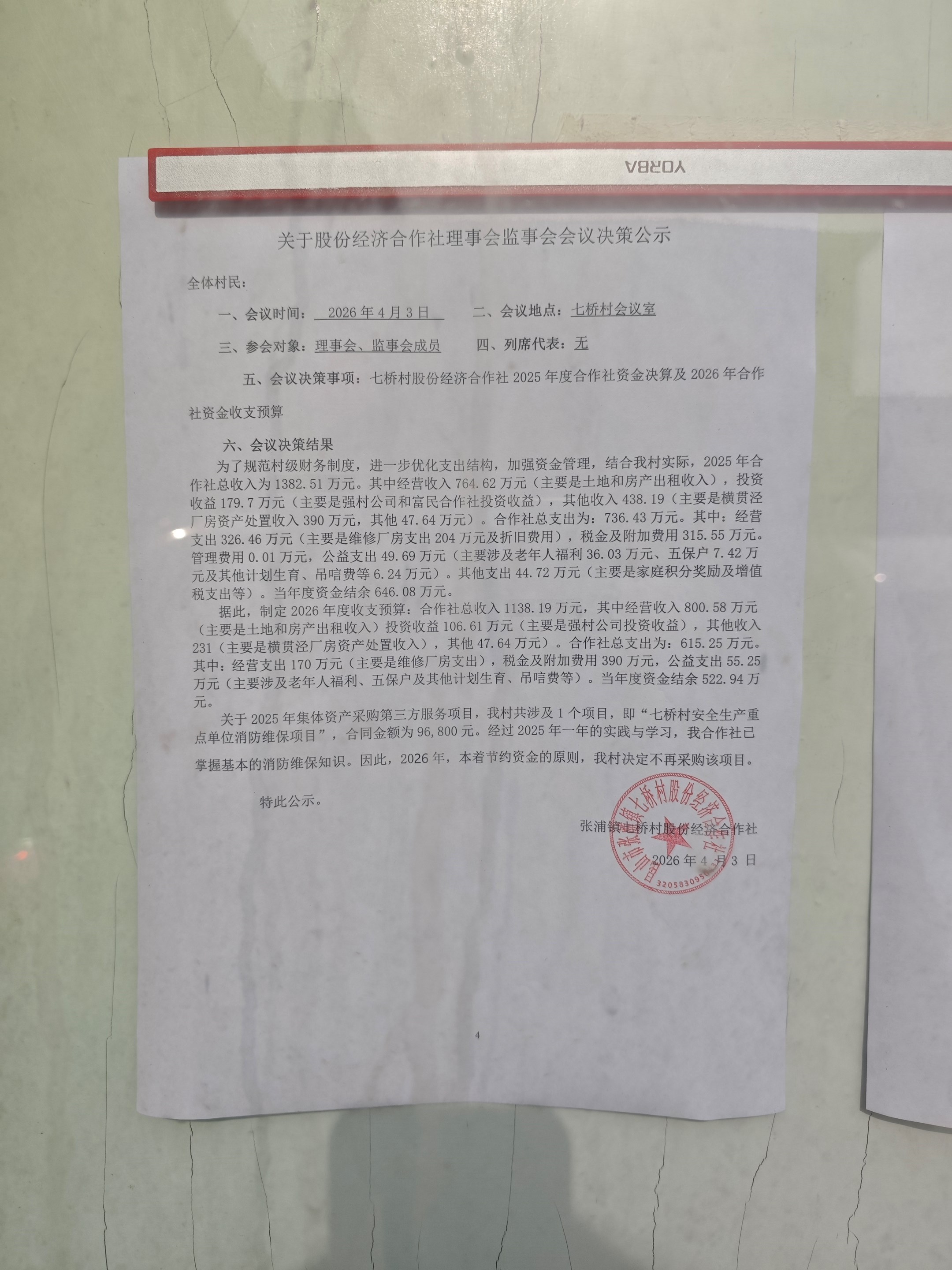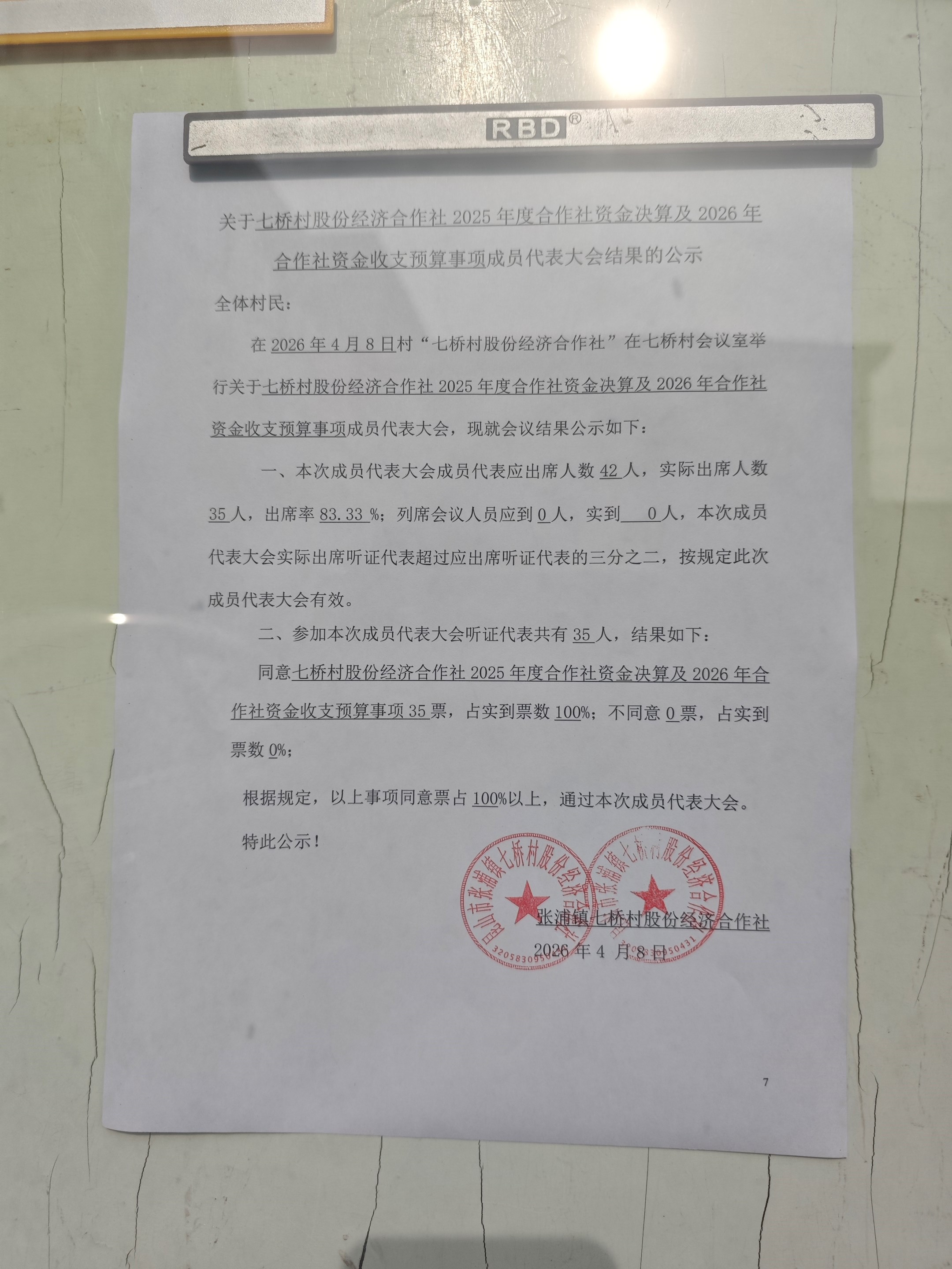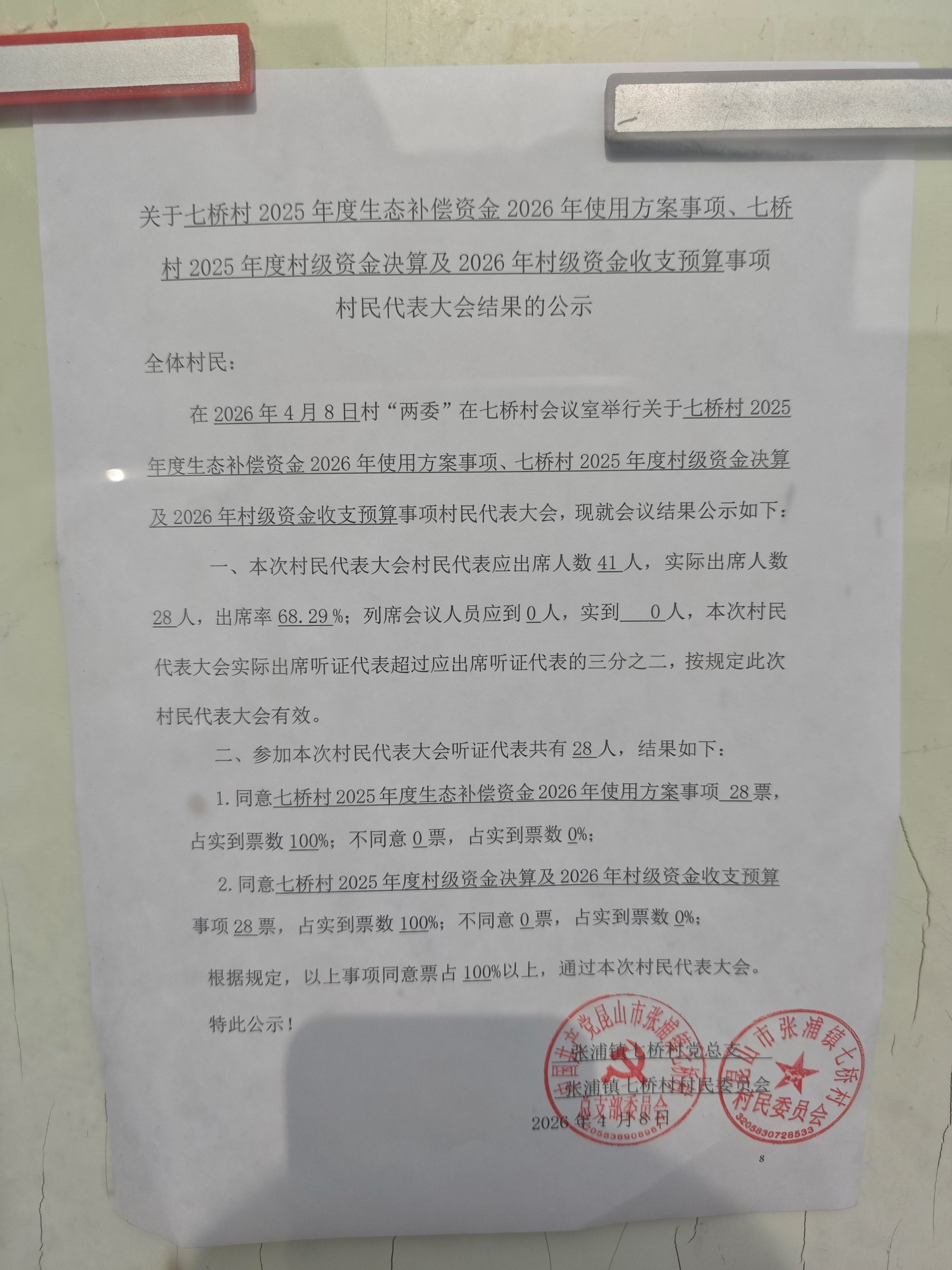 七桥村民委员会生态补2025年决算和2026年预算及股份经济合作社预决算会议决议