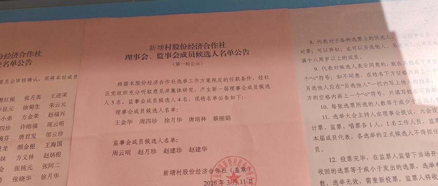 新塘村股份经济合作社 理事会、监事会成员候选人名单公告(第一轮公示)