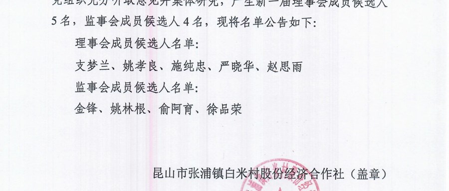白米村股份合作社理事会、监事会成员候选人名单公示