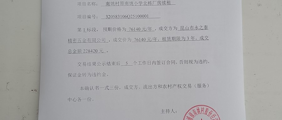 昆山市永之泰精密五金有限公司2025-2028成交确认公示