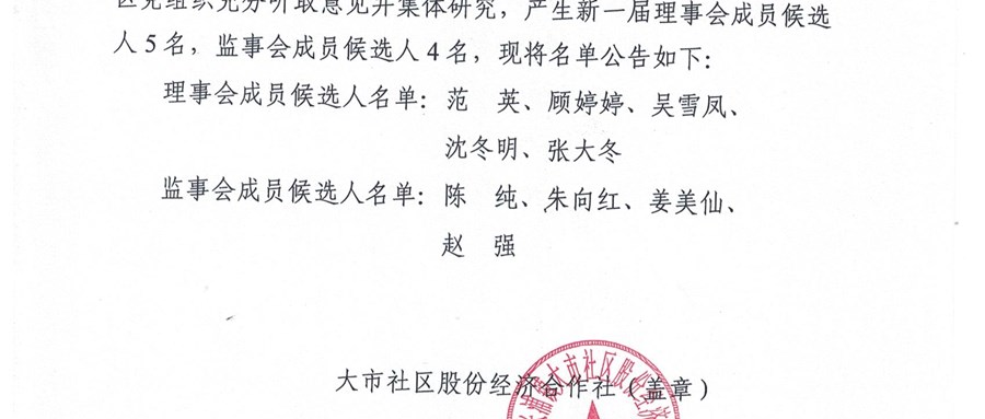大市社区股份经济合作社换届选举理事会、监事会成员候选人名单第一次公示