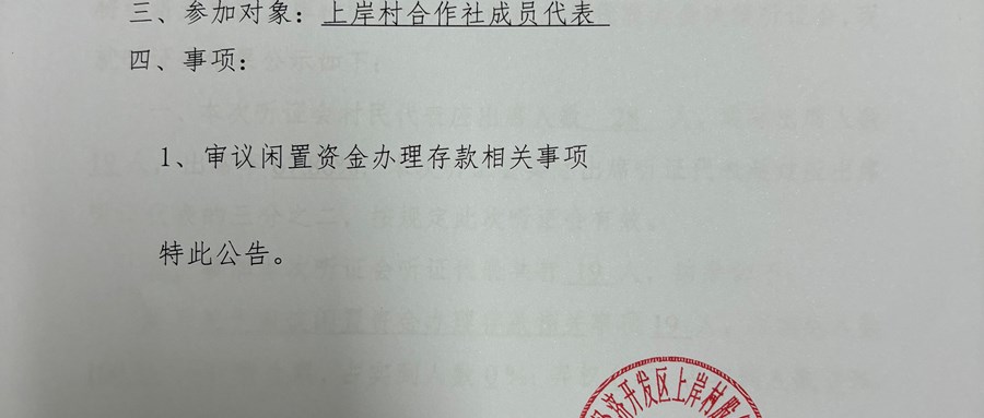 上岸村股份经济合作社关于审议闲置资金办理存款相关事项的成员代表大会