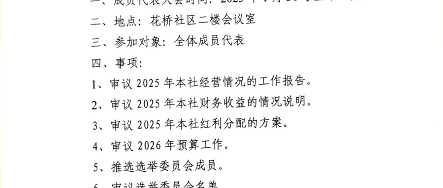 2026年蓬善村股份经济合作社1月成员代表大会会前公告