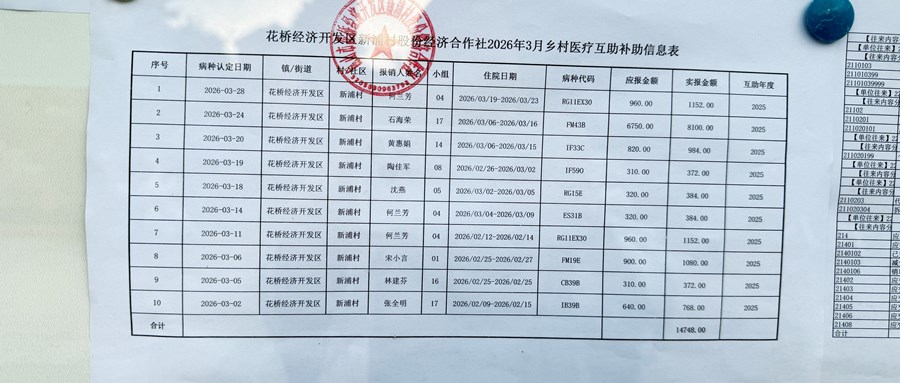 新浦村股份经济合作社2026年3月乡村医疗互助补助信息表公示