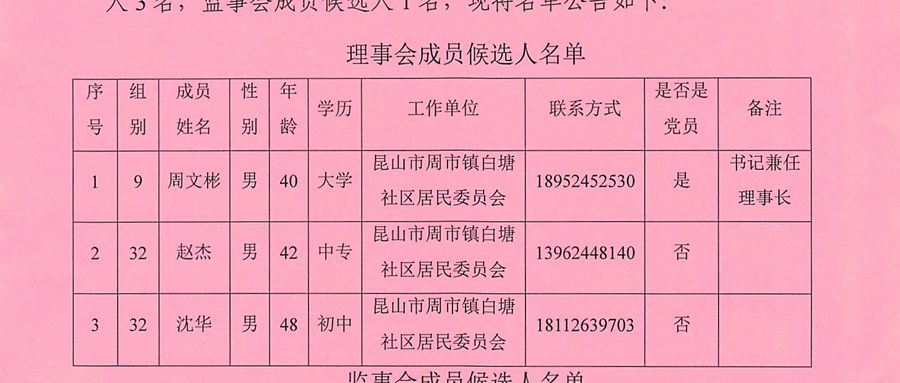 白塘社区股份经济合作社理事会、监事会成员候选人名单公告