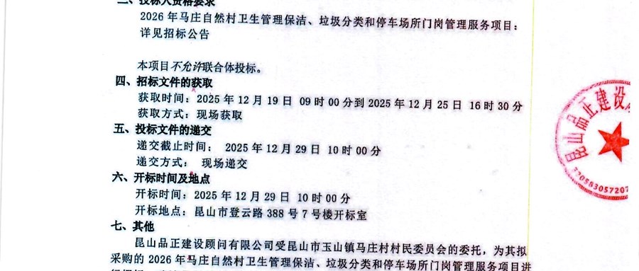 · 2026年马庄自然村卫生保洁、垃圾分类和停车场所门岗管理招标公告