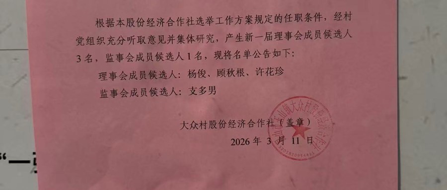 大众村股份经济合作社 理事会、监事会成员候选人名单公告