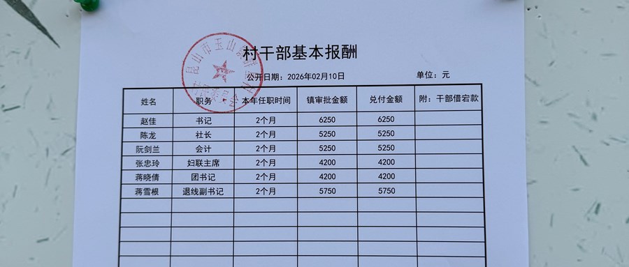昆山高新区群星村2026年02月份公开村干部基本报酬信息