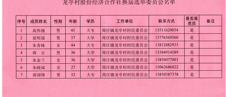 龙亭村股份经济合作社换届选举委员会名单公告