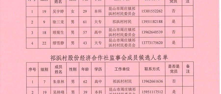 祁浜村股份经济合作社理事会、监事会成员候选人名单公告