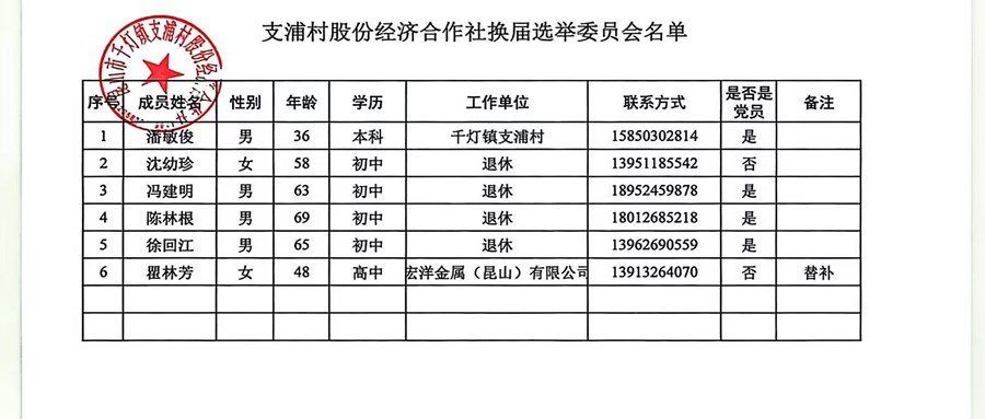 支浦村股份经济合作社换届选举委员会名单