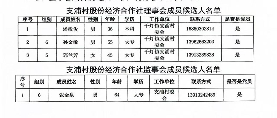 支浦村股份经济合作社 理事会、监事会成员候选人预备名单公告