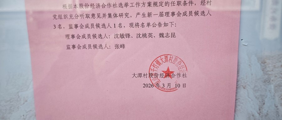大潭村股份经济合作社理事会、监事会成员候选人预备名单公告