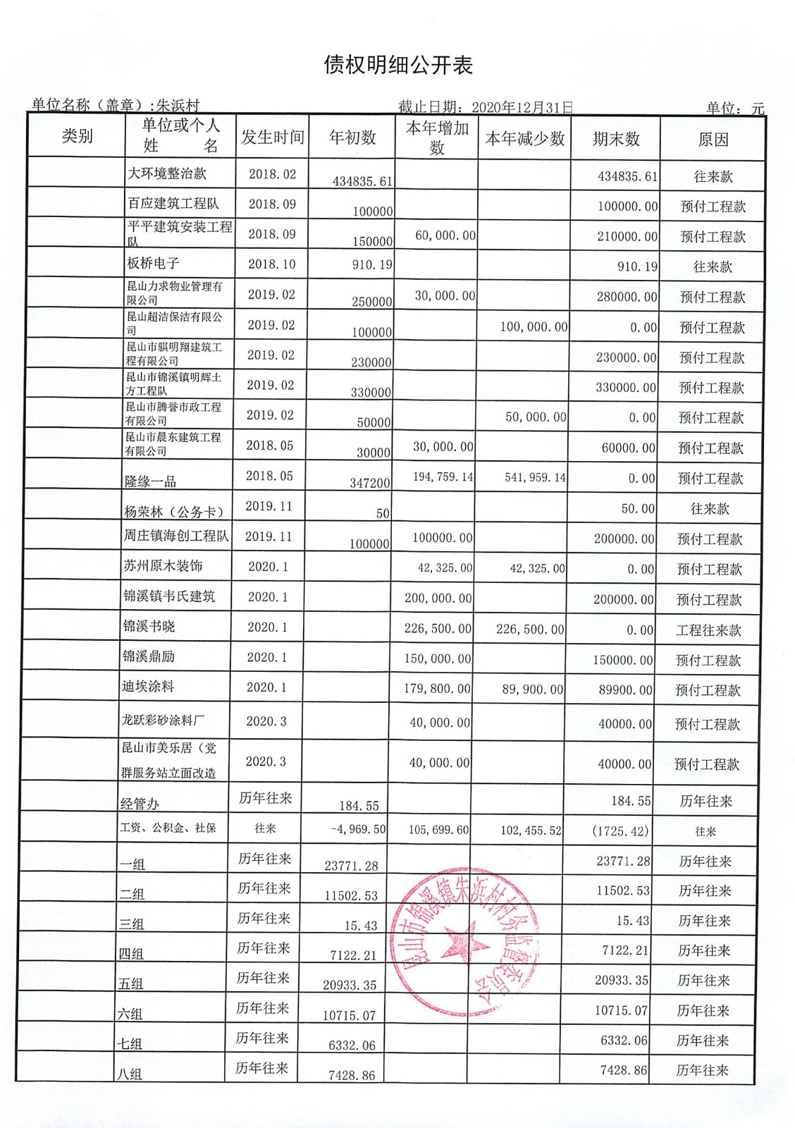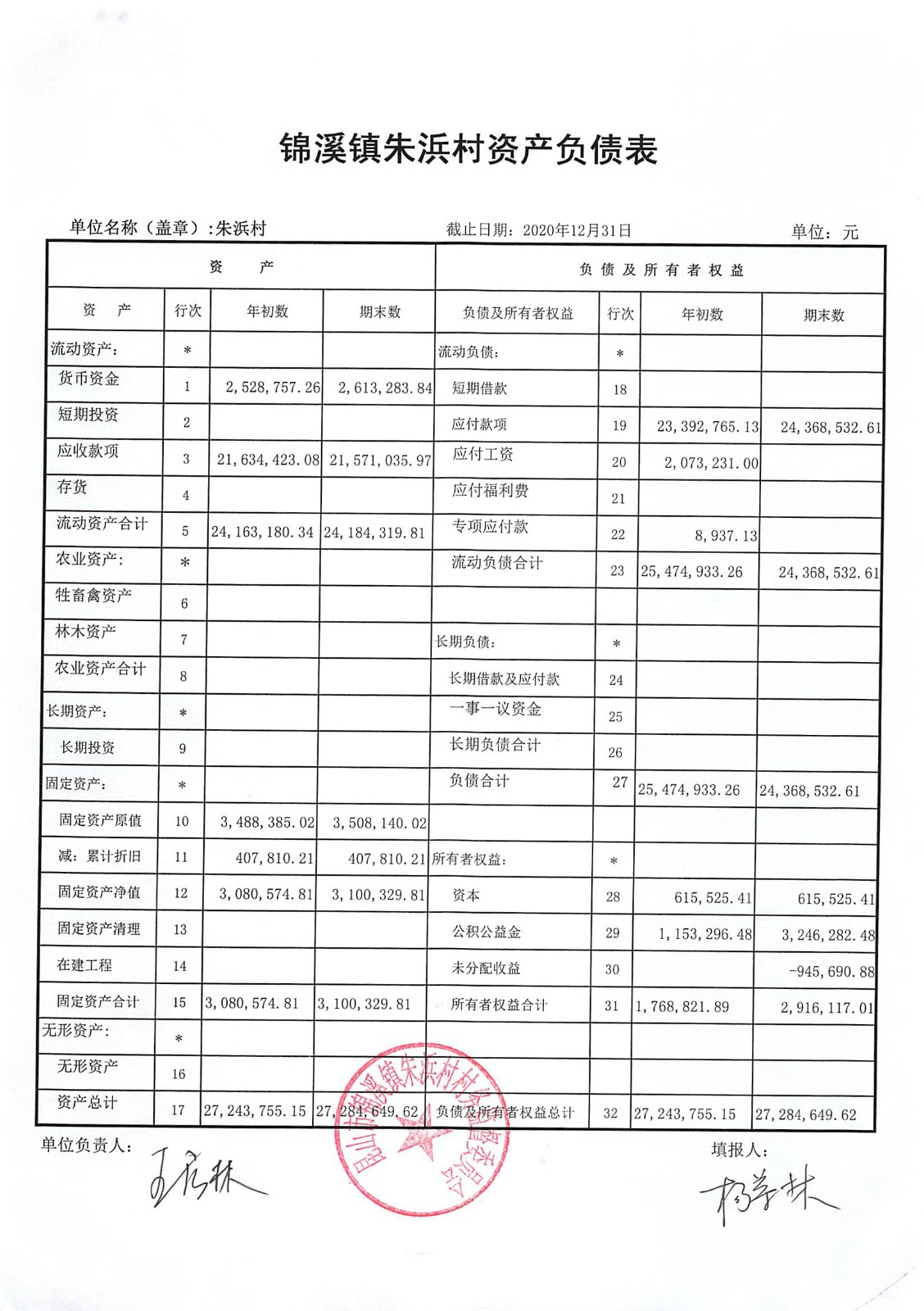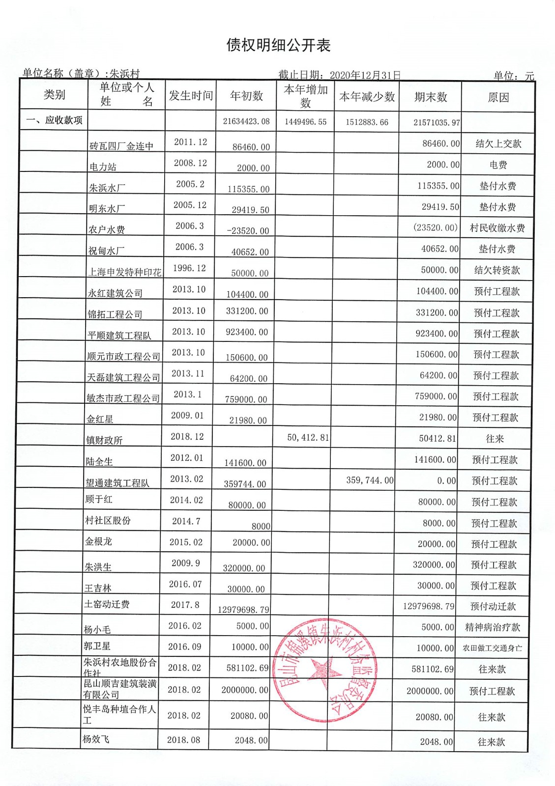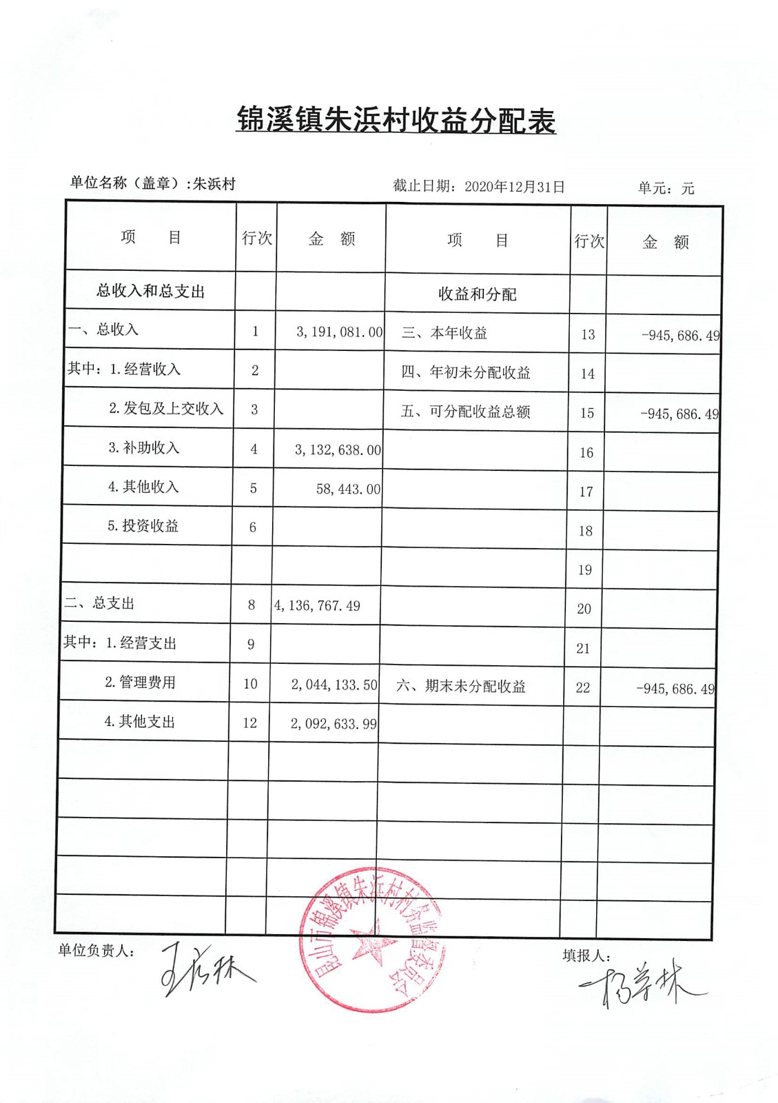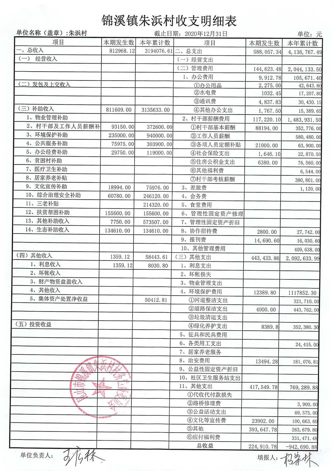 2020年朱浜村第四季度财务公开资料