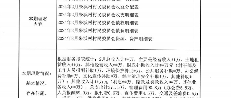 2024年朱浜村2月份财务公开资料