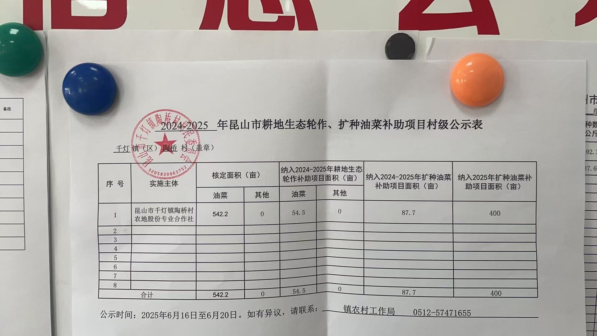 2025年昆山市耕地生态轮作、扩种油菜补助项目村级公示表