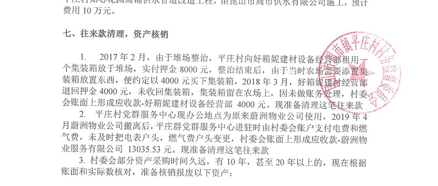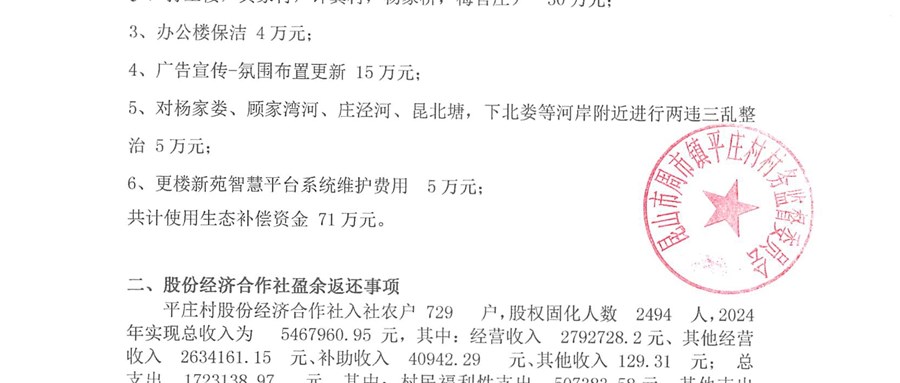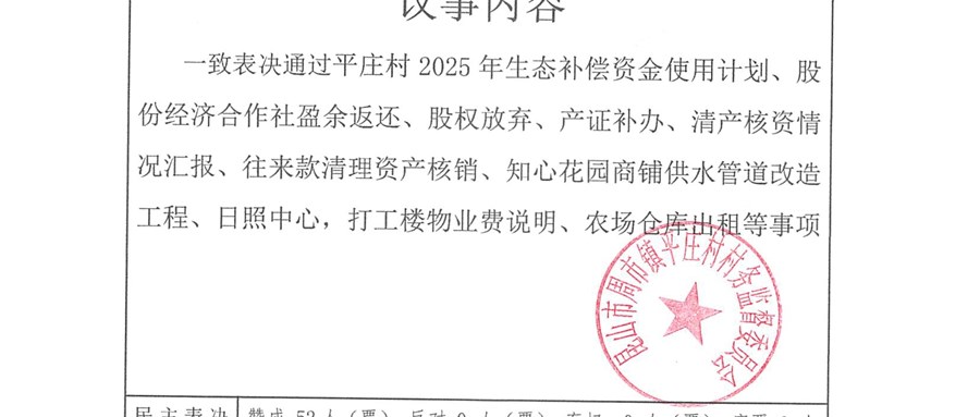 关于平庄村2025年生态补偿资金使用计划、股份经济合作社盈余返还、股权放弃、产证补办、清产核资情况汇报、往来款清理资产核销、知心花园商铺供水管道改造工程等事项简介