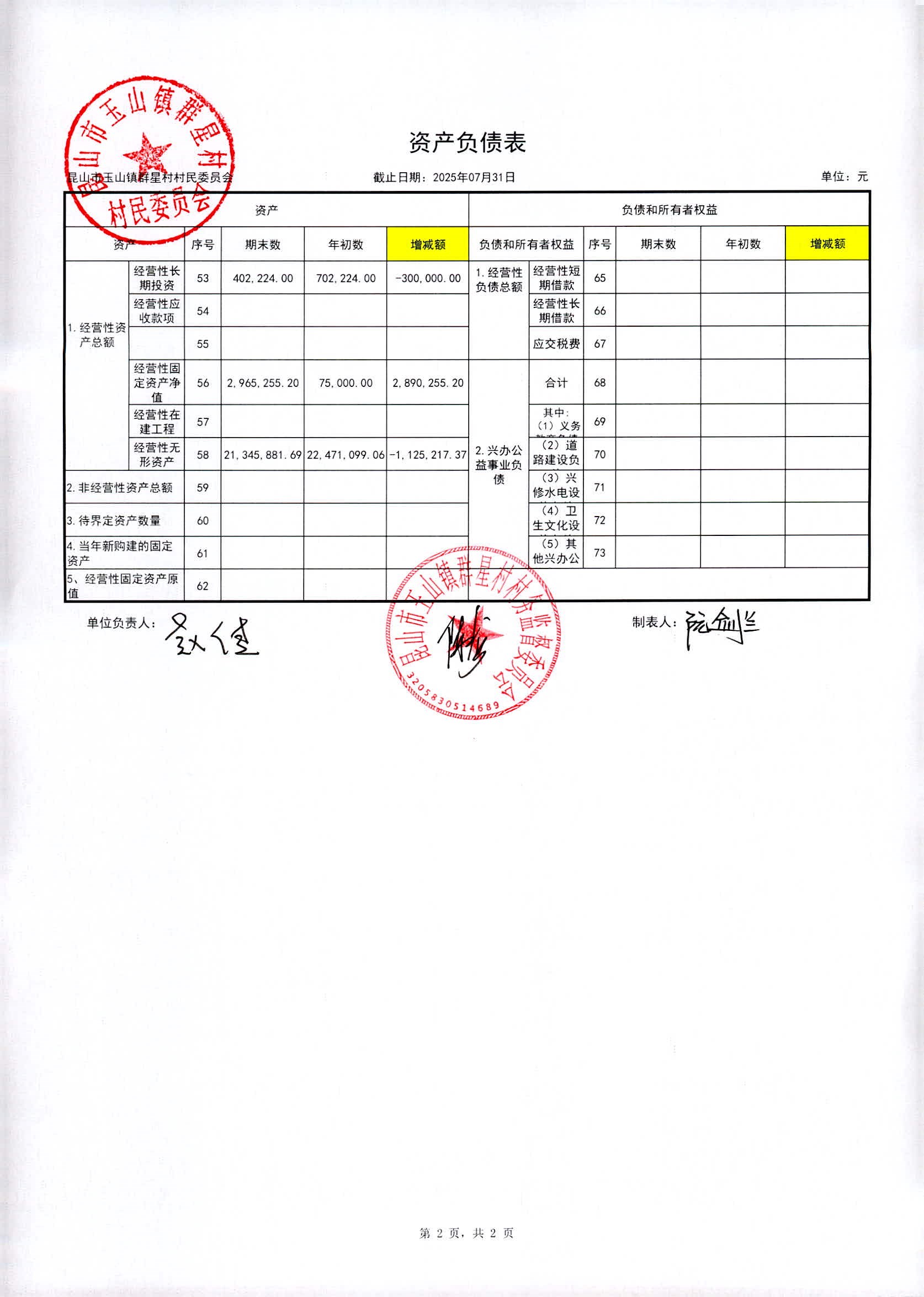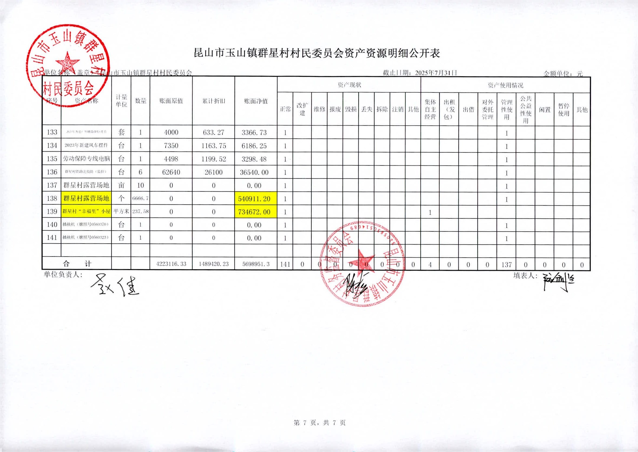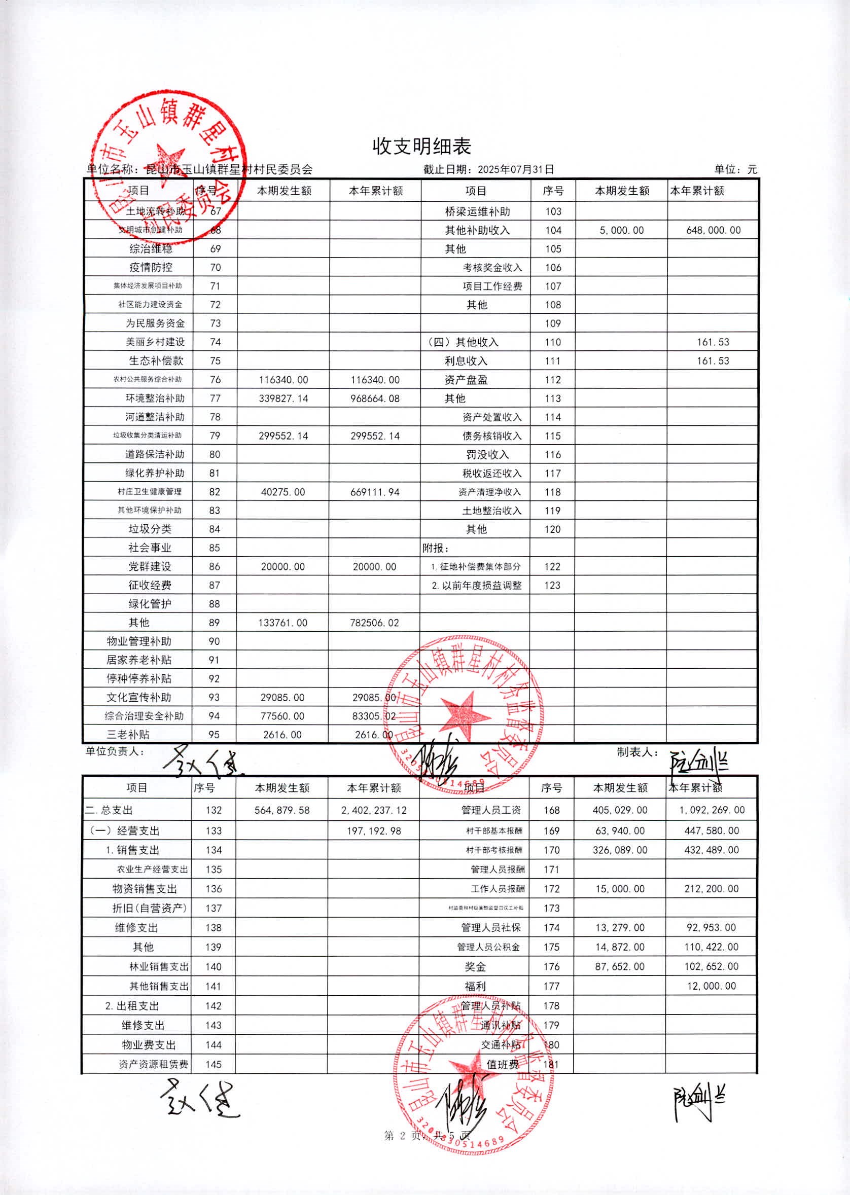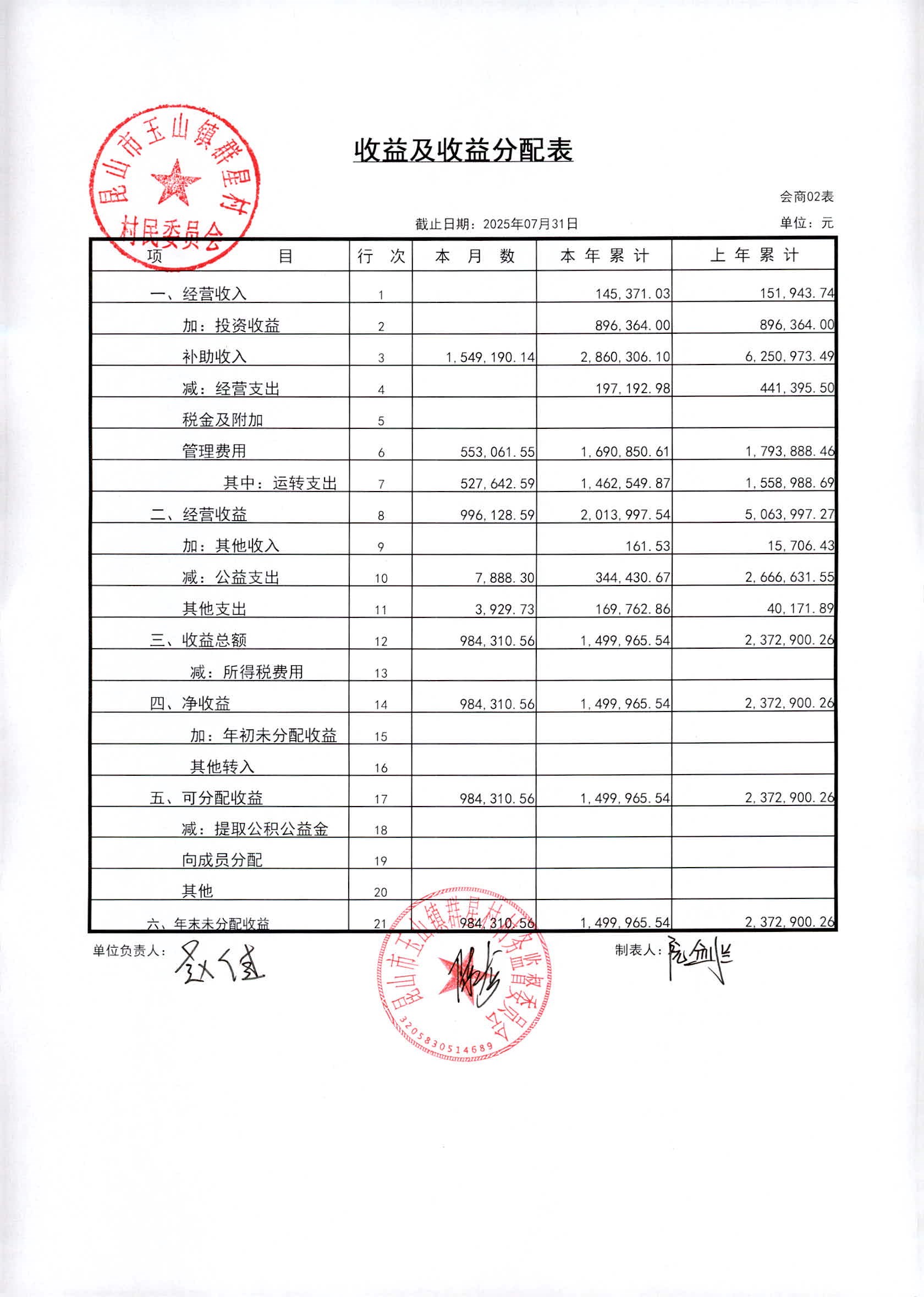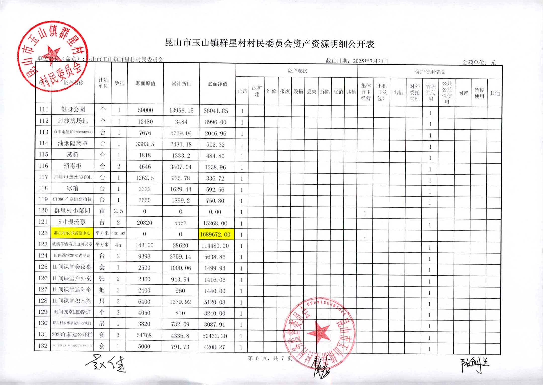 昆山高新区群星村2025年08月份公开村民委员会07月财务信息