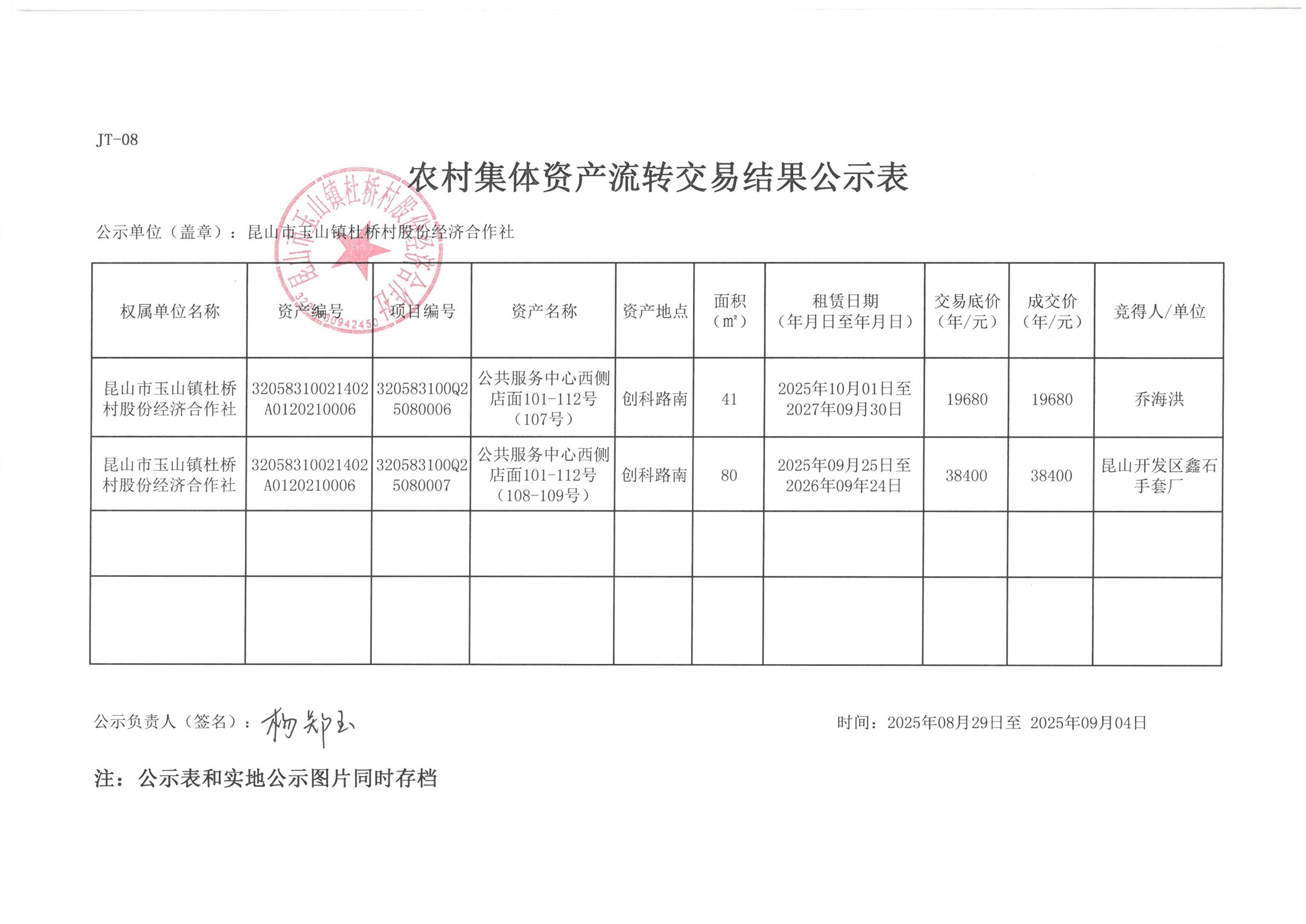 杜桥股份经济合作社农村集体资产流转交易结果公示表(乔海洪、鑫石)