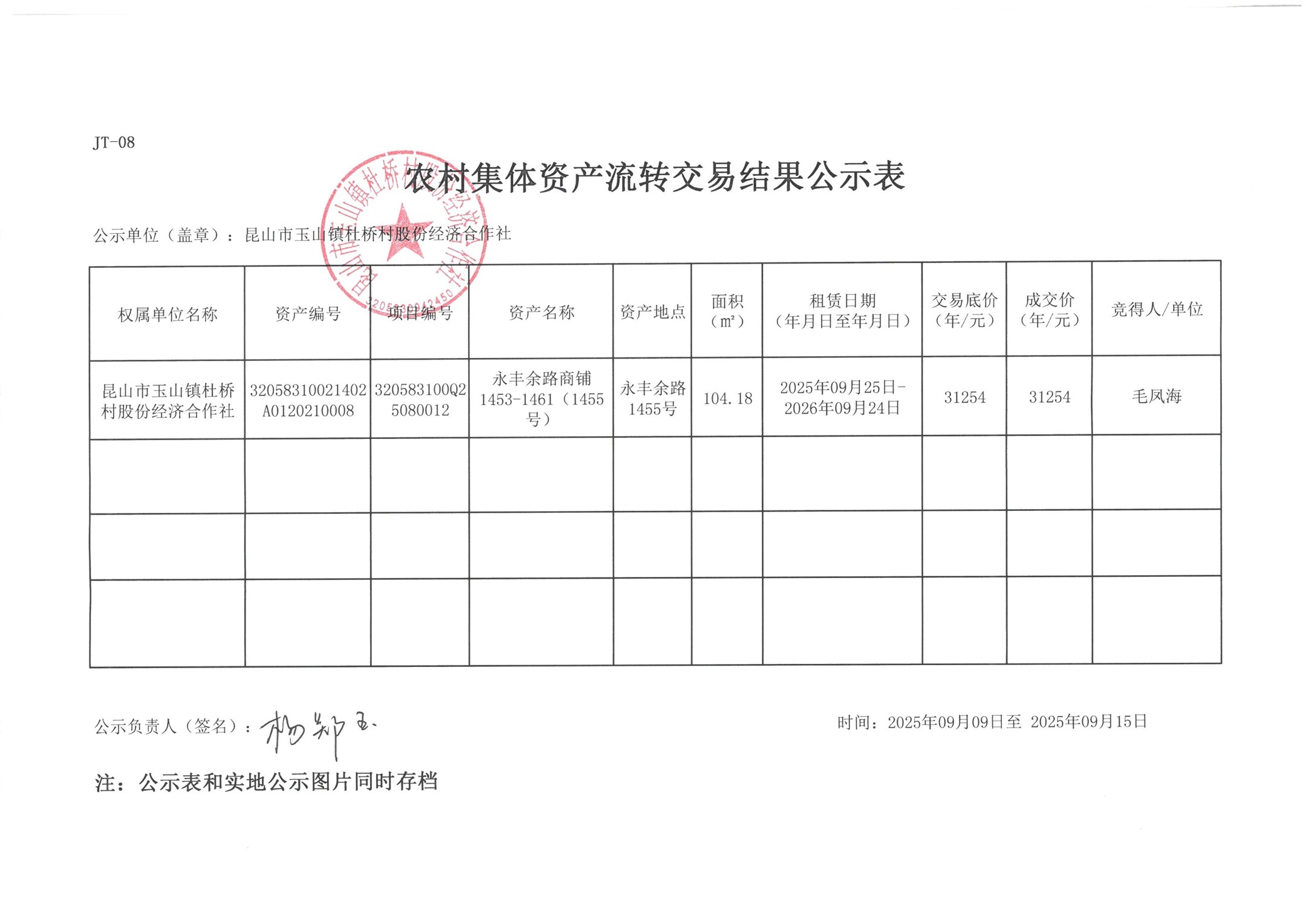 杜桥股份经济合作社农村集体资产流转交易结果公示表(毛凤海)