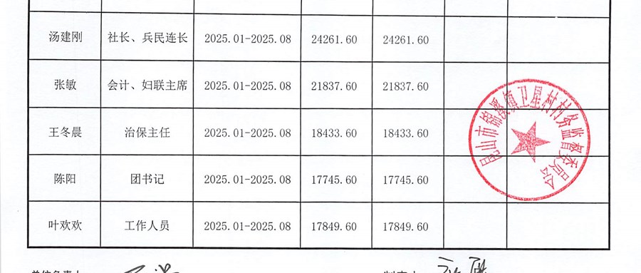卫星村2025年8月财务公开:村干部基本报酬