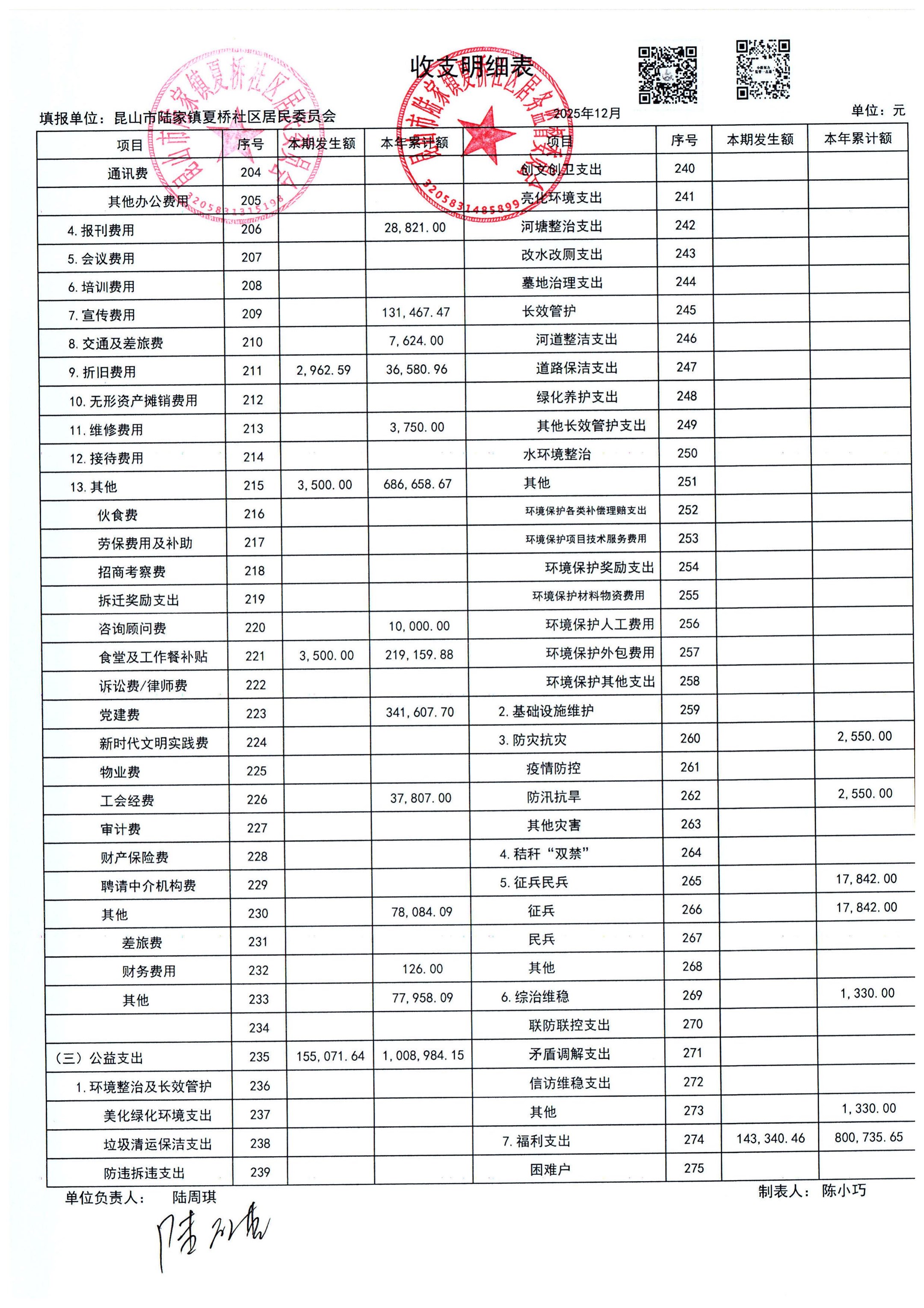 夏桥社区2026年1月份财务公开