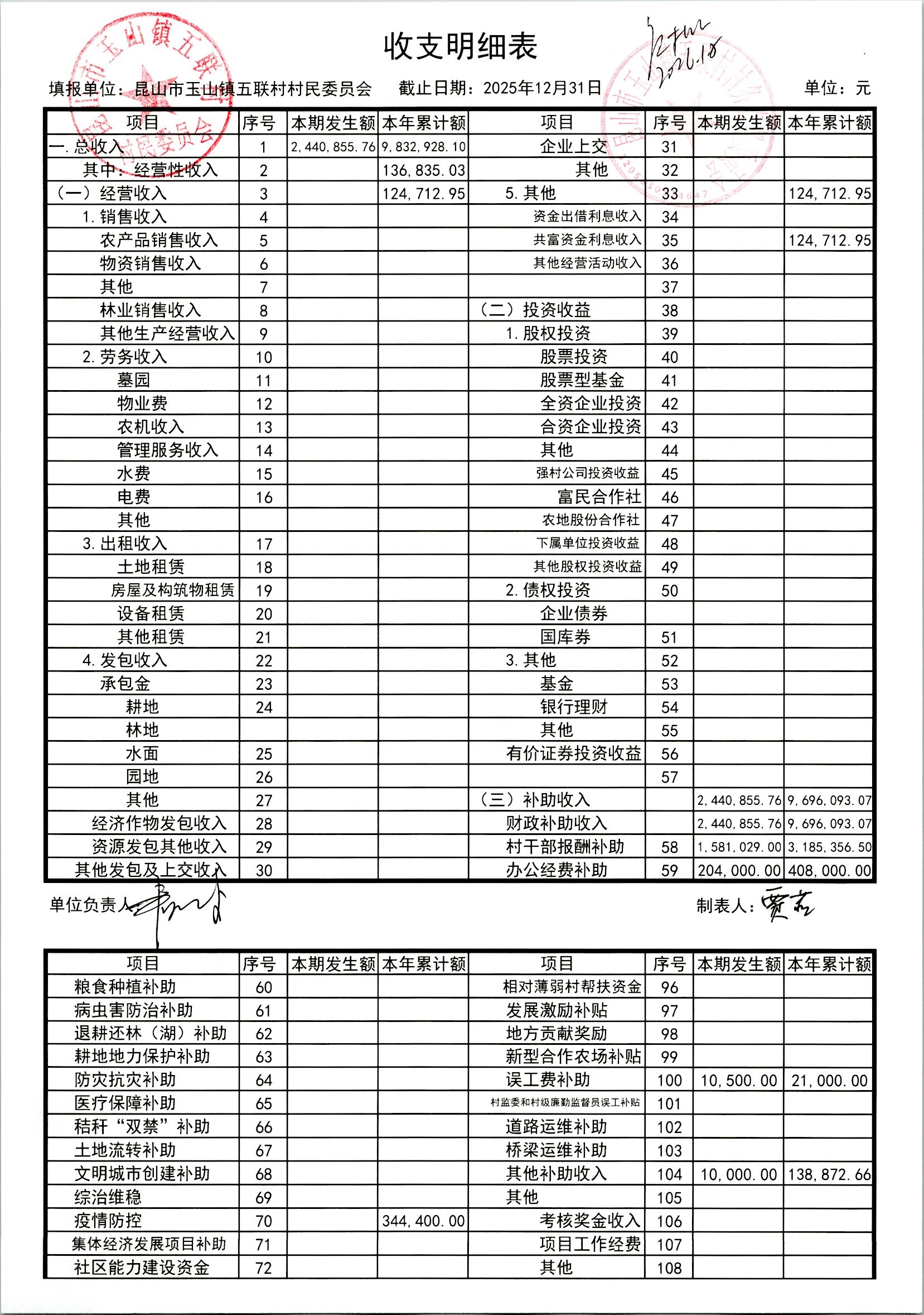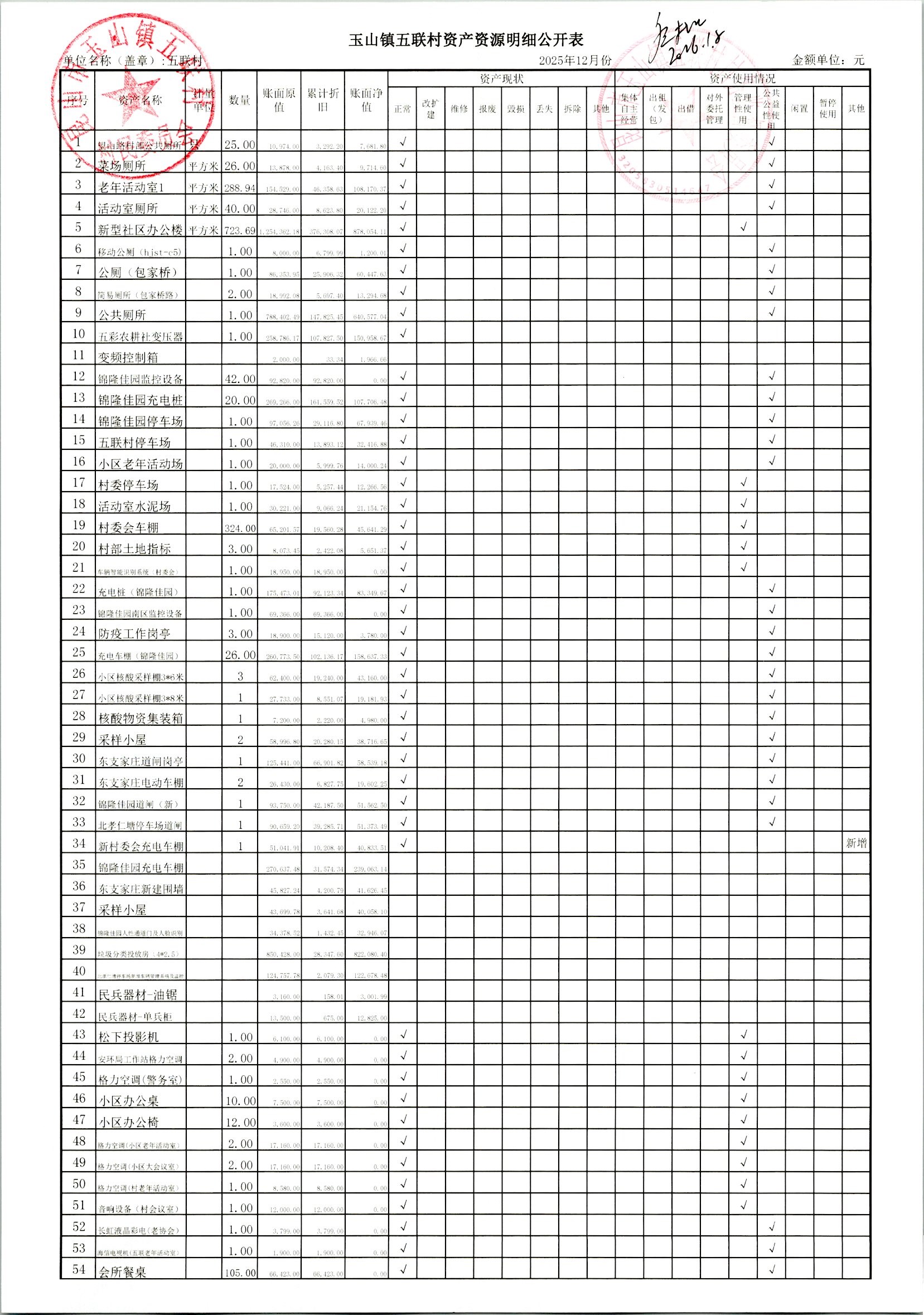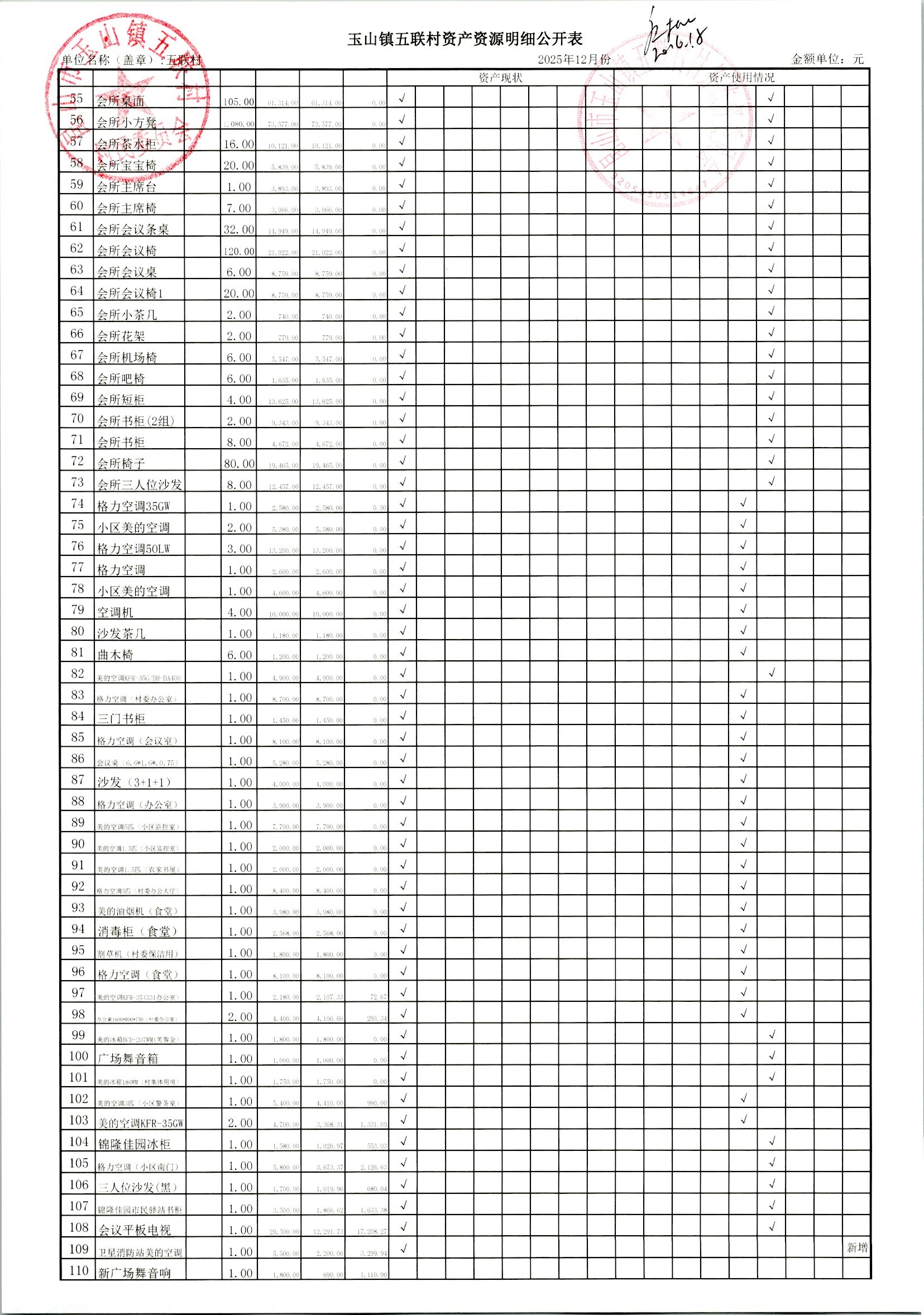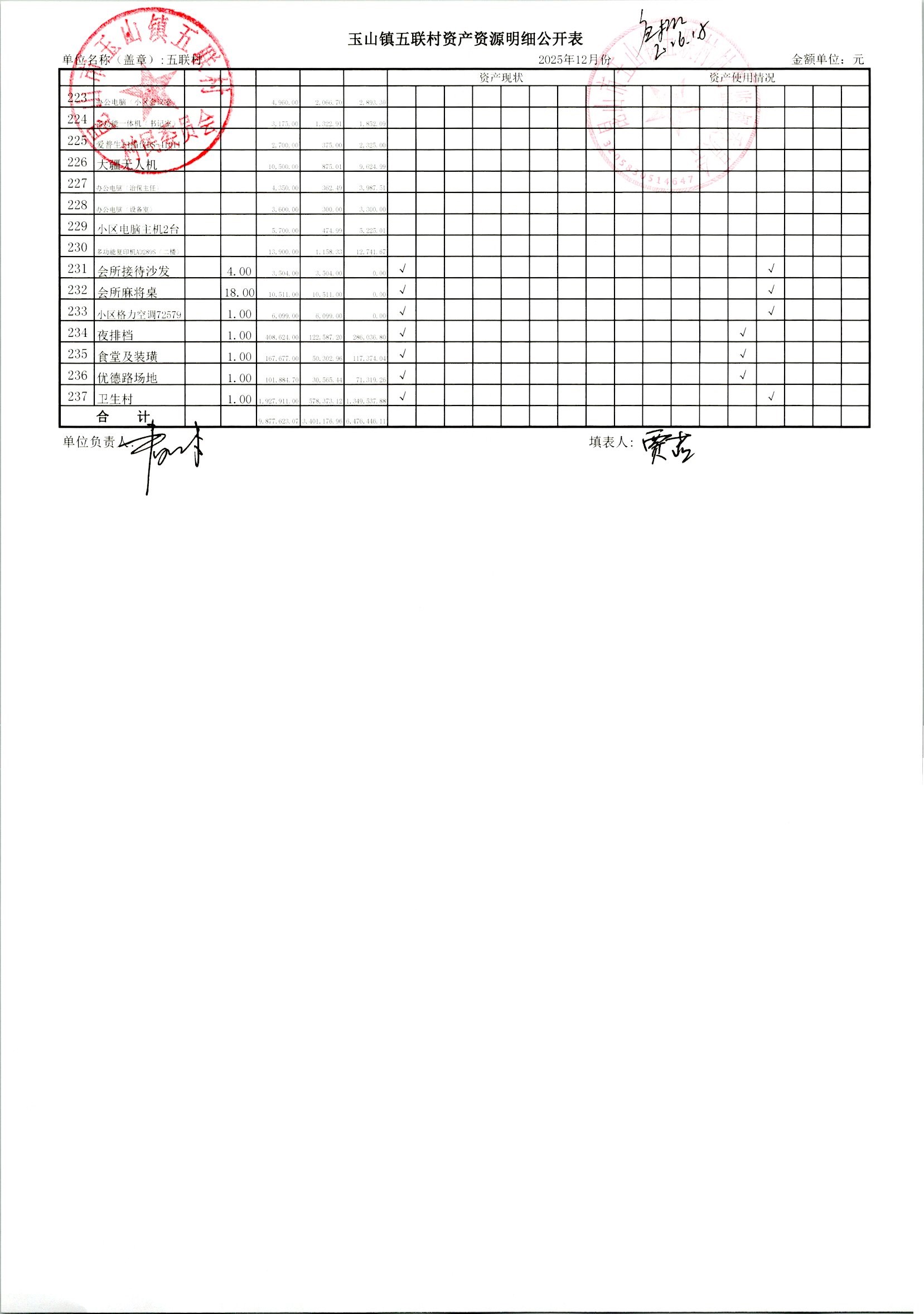 2026年1月村委会财务定期公开
