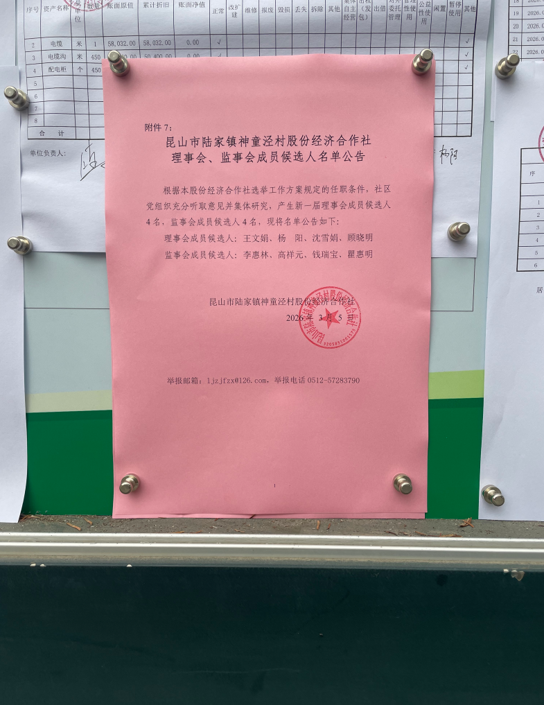 昆山市陆家镇神童泾村股份经济合作社理事会、监事会成员候选人名单公告