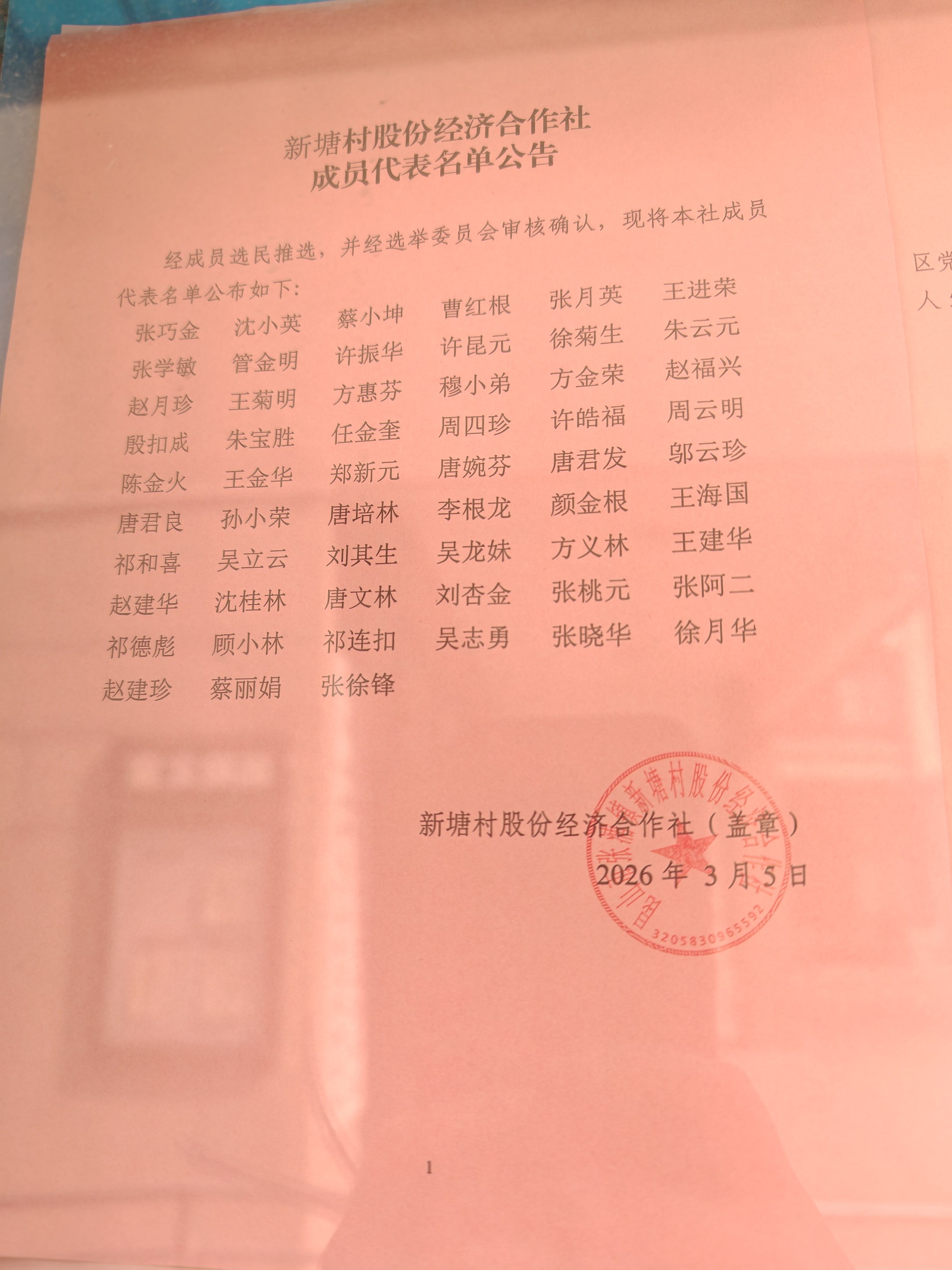新塘村股份经济合作社成员代表名单公告