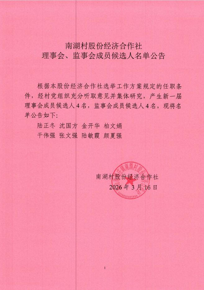 南湖村合作社理事、监事成员候选人第二次公告