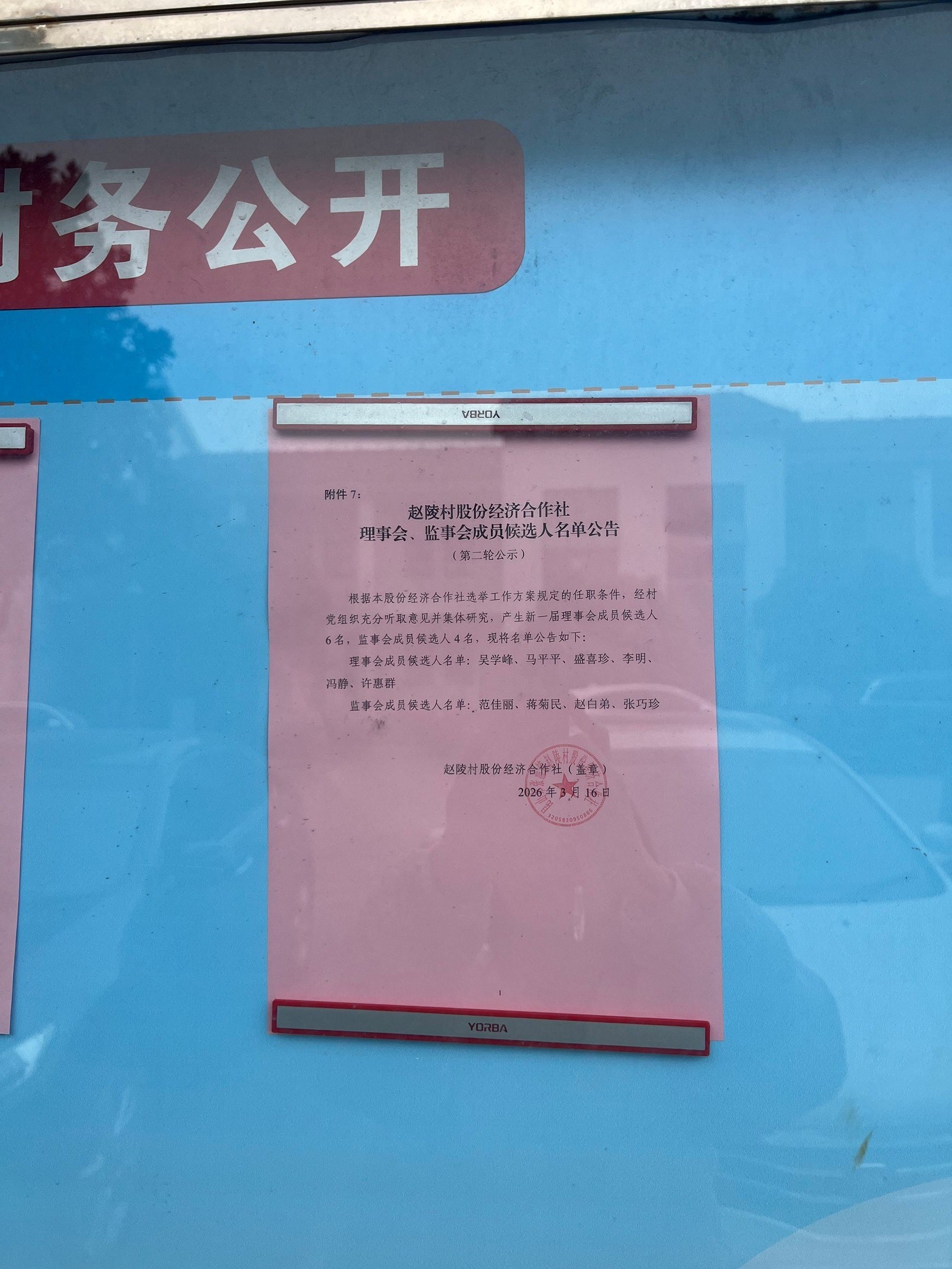 赵陵村股份经济合作社理事会、监事会成员候选人名单公告(第二轮公示)