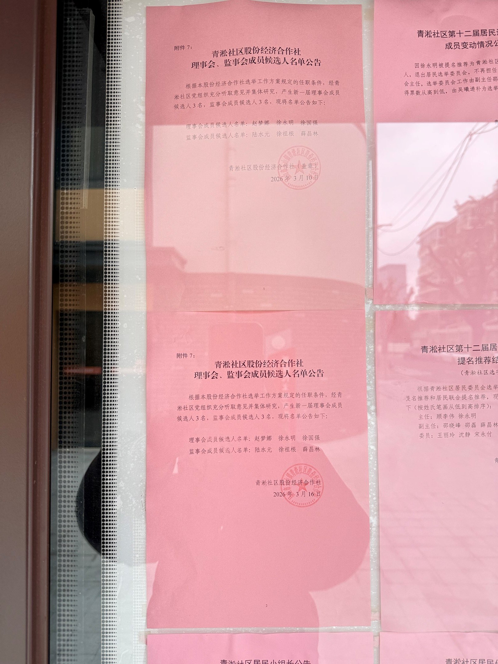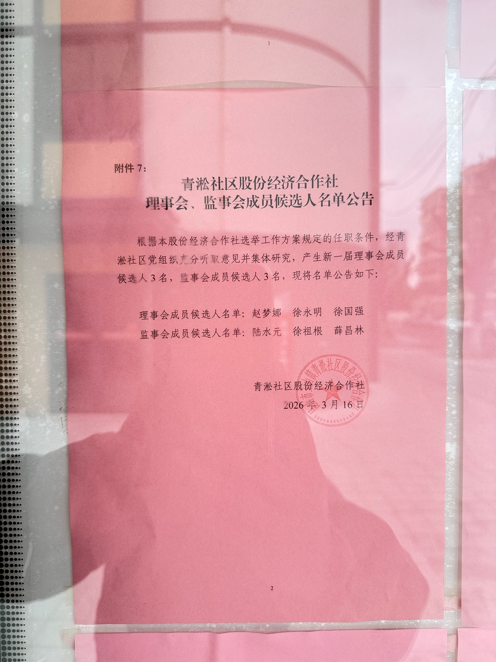 青淞社区股份经济合作社换届选举理事会、监事会成员候选人名单第二轮公告