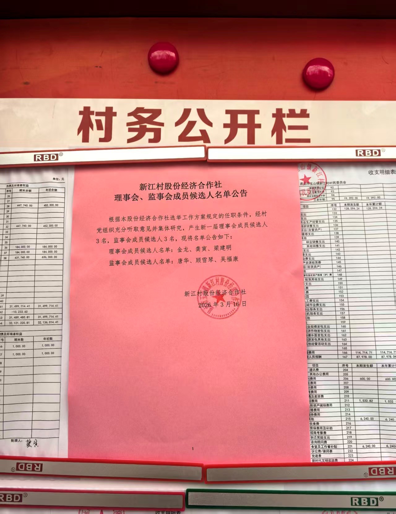 新江村股份经济合作社理事会、监事会成员候选人名单公告(第二轮)