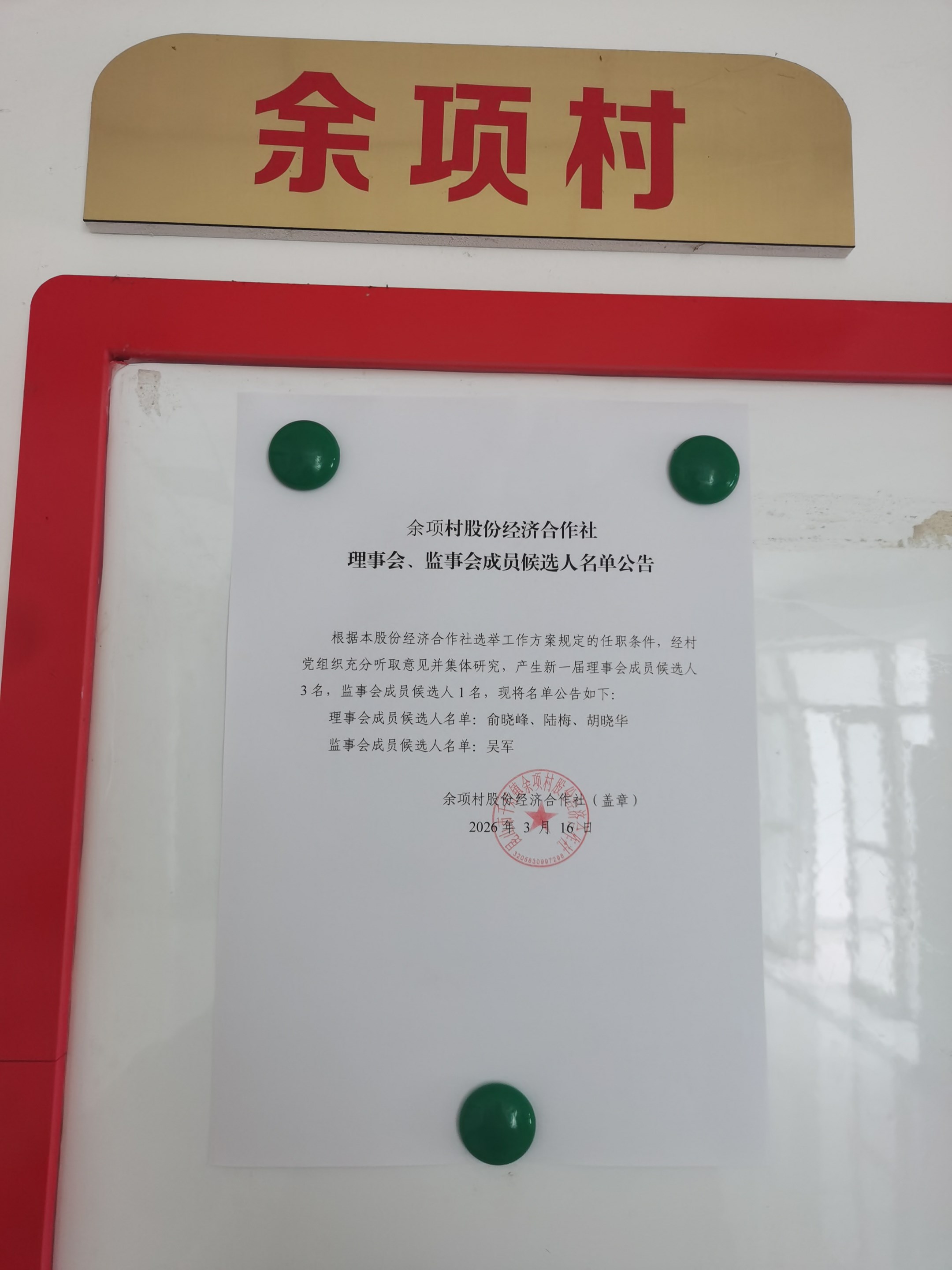 余项村股份经济合作社理事会、监事会成员候选人名单公告