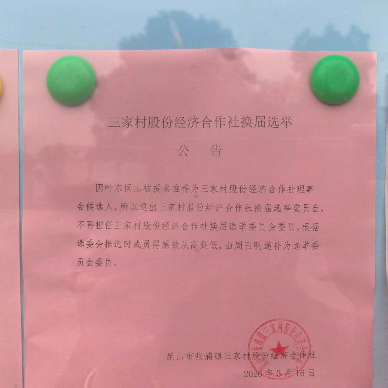 三家村股份经济合作社换届选举(理事会候选人退出选举委员会公告)